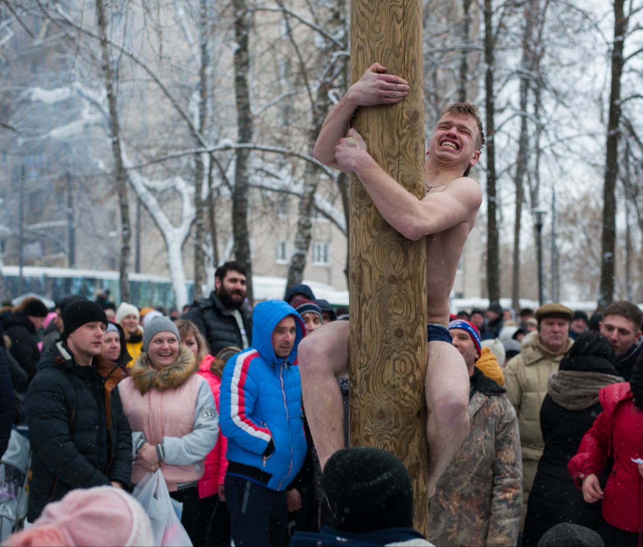 Самые спортивные смогут попробовать взобраться на масленичный столб.