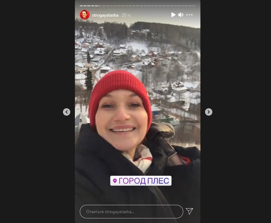 Таша Строгая вела хроники путешествия в сторис на своей странице в соцсети "Инстаграм". Телеведущую восхитили "фантастические" виды Плёса со смотровой площадки "Частного визита" и у дома художников Жуковых. Отзываясь о самом отеле "Частный визит", где разместились гости, Строгая отметила, что "здесь очень аутентично".