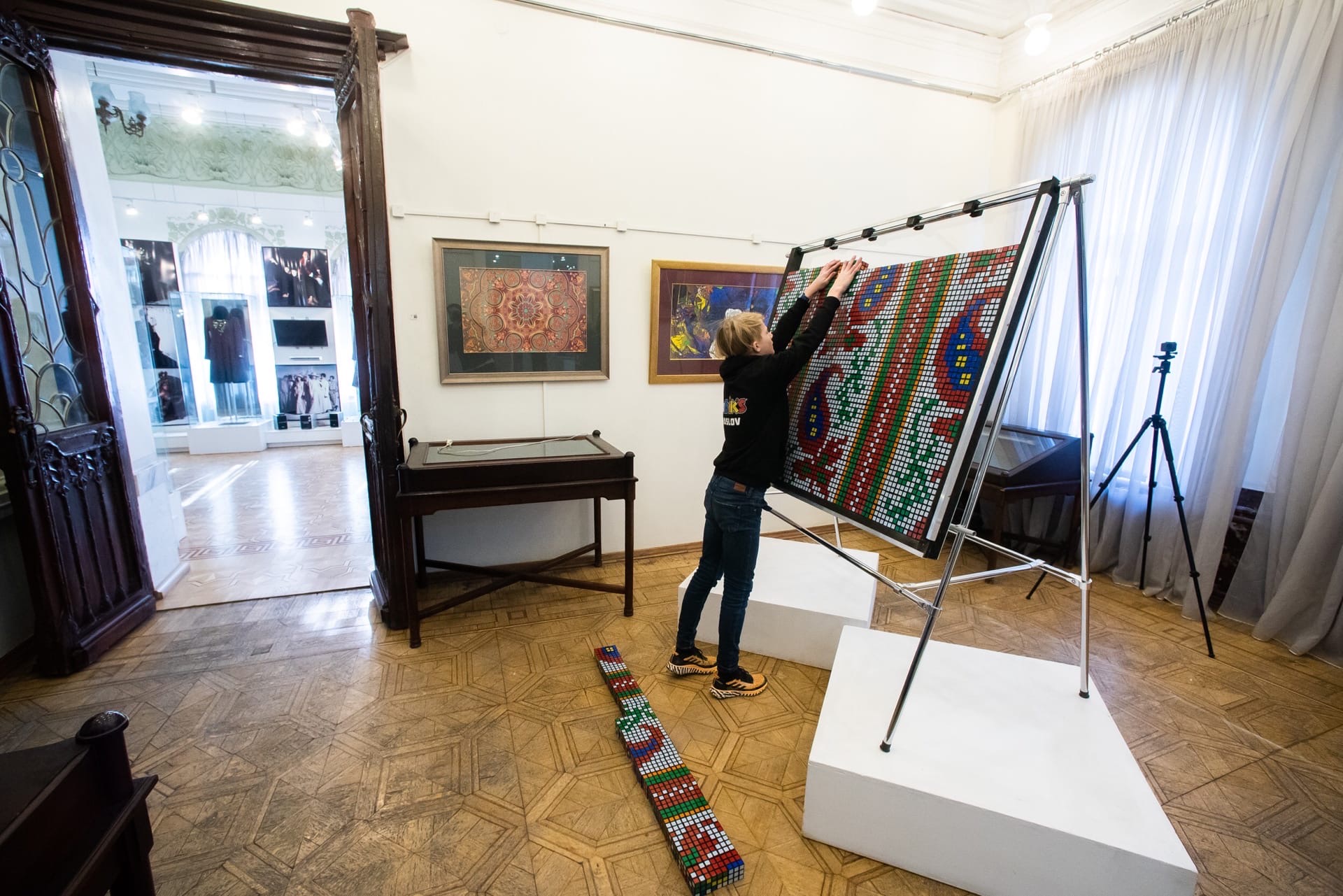 В Музее ивановского ситца появился новый арт-объект: двусторонняя мозаика из кубиков Рубика. Ее сложил 13-летний спидкубер Андрей Маслов по мотивам исторического текстильного узора 1893 г. Ивановской фабрики Гандуриных, получившего Гран-при всемирной выставки в Чикаго почти 130 лет назад. Об этом Андрей Маслов рассказал в своем инстаграм-аккаунте.