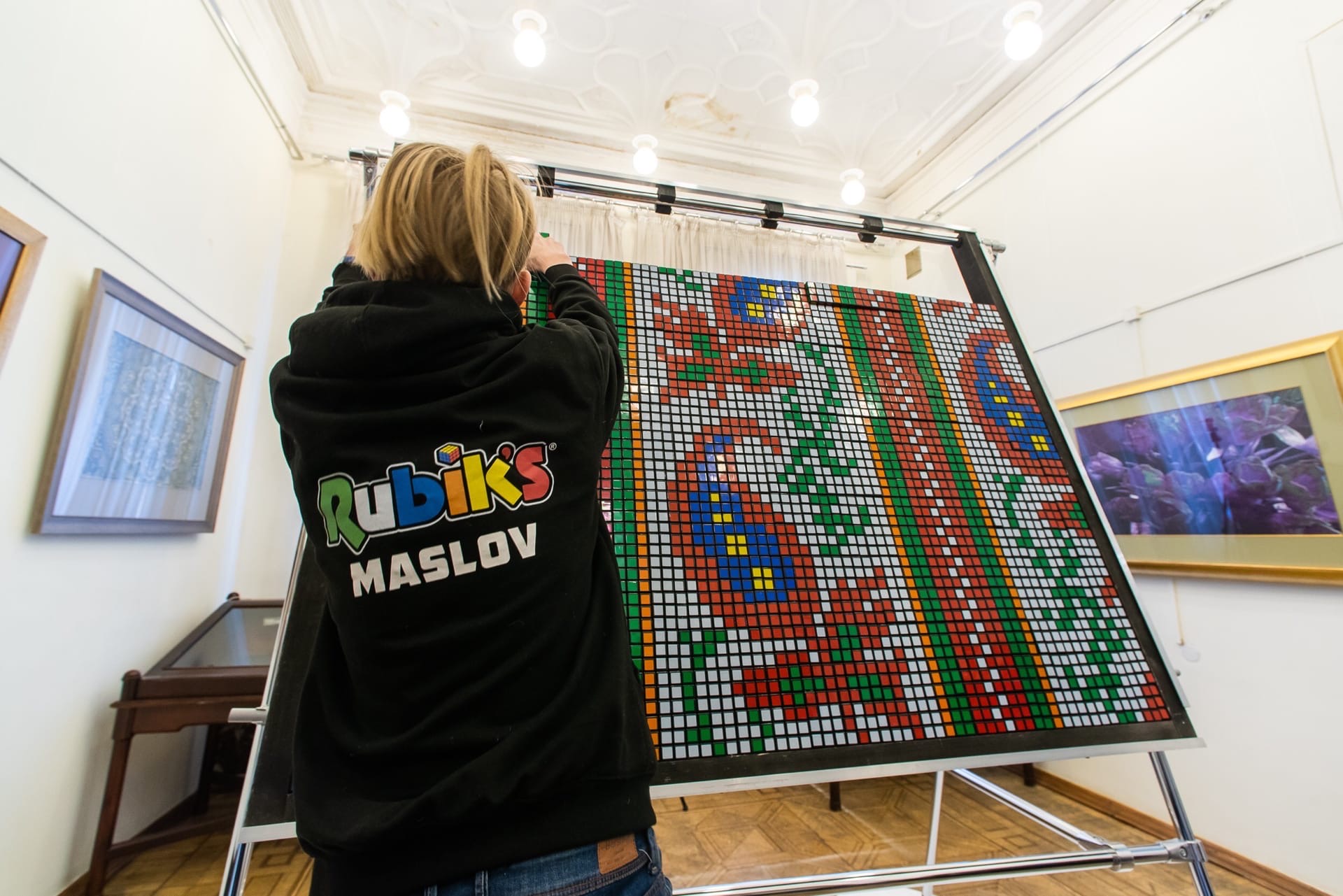 "Мозаика собрана из 480 кубиков Рубика, ее я сделал на своей первой персональной выставке. Для мозаики я придумал 67 алгоритмов, теперь планирую опубликовать руководство по созданию таких панно", – написал автор. Уникальность двусторонней мозаики в том, что рисунок картины толщиной в один кубик – с двух сторон, что является крайне сложной математической задачей, и двустороннюю мозаику такого уровня никто в мире до Андрея Маслова не делал.