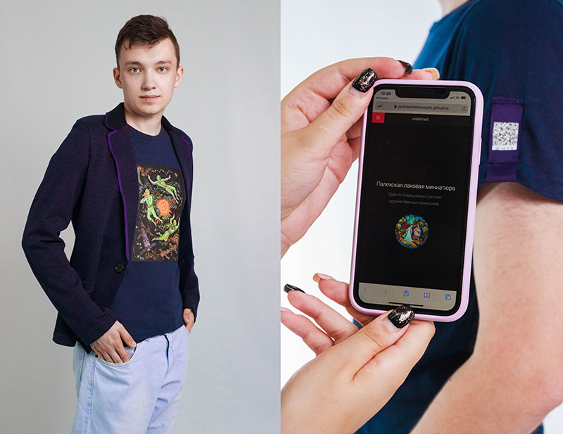 Магистранты Сабина Абилова и Полина Стрельцова поместили на трикотаж целый пласт истории и брендов Ивановской области: они перенесли на одежду QR-коды, которые отсылают к сайтам с рассказанми знаковых достопримечательностях города и палехской лаковой миниатюре. Сайты и QR-коды девушки разрабатывали самостоятельно – сначала печатали их на бумаге, а затем переносили на ткань.