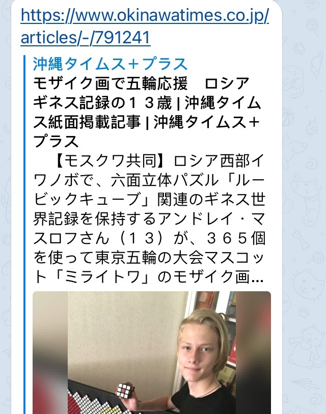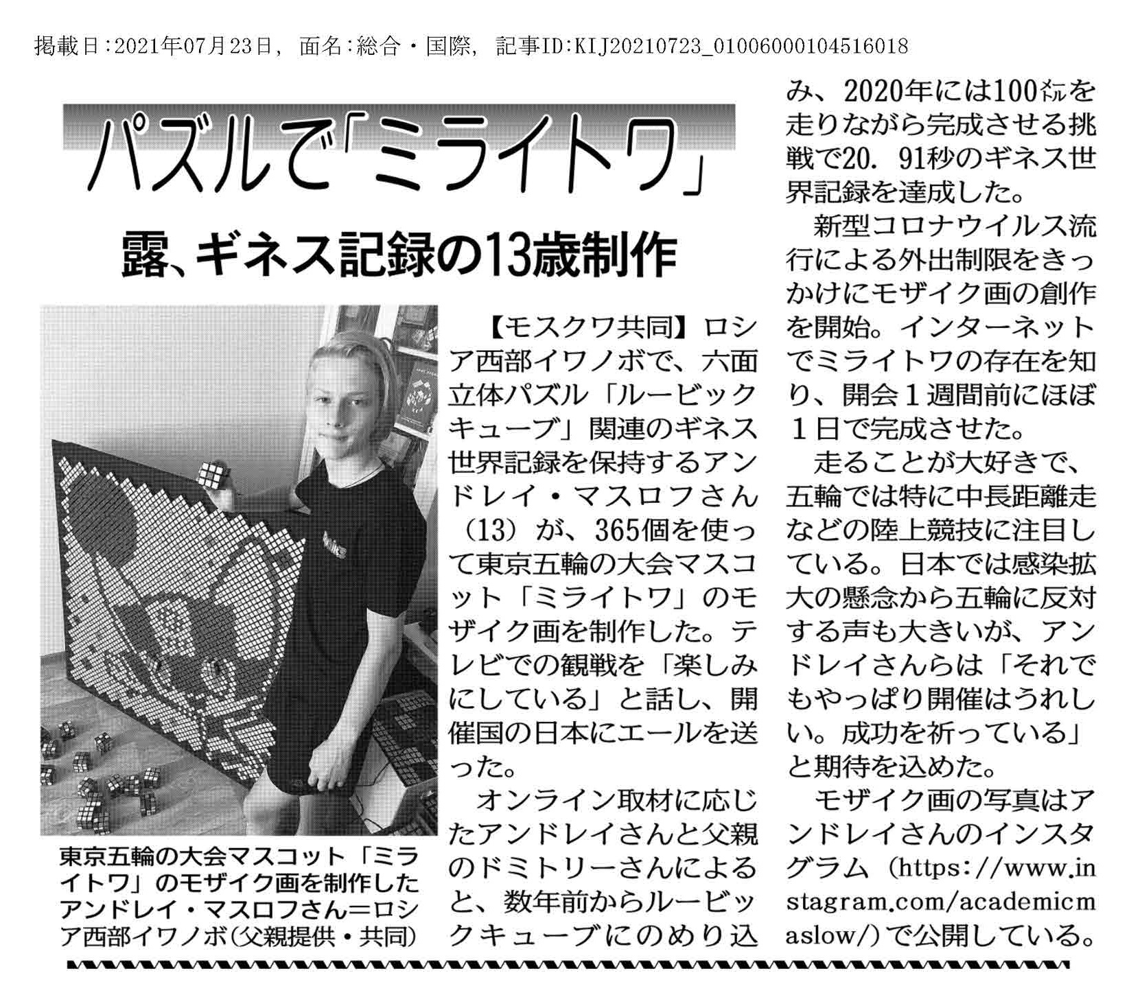 Об ивановском спидкубере, его кубических мозаиках и рекорде Гиннесса читают японцы: несколько изданий напечатали на своих бумажных и электронных страницах заметки про 13-летнего Андрея Маслова. На семью талантливого парня вышли журналисты японского информагентства "Киодо Цусин" через посольство после того, как он собрал из 365 кубиков Рубика один из символов Олимпийских игр в Токио – сине-белого Мирайтову.