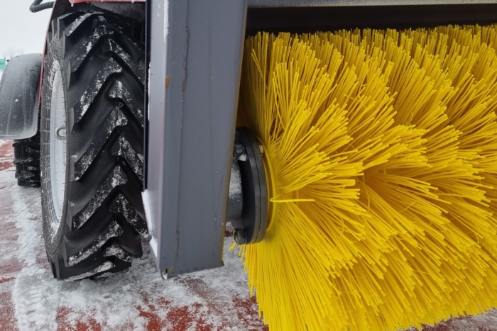 Приспосабливаться к разным погодным условиям трактору поможет навесное оборудование. Поворотный снегоотвал, коммунальная щетка и фронтальный погрузчик позволят убирать зимой снег, не повреждая резиновую крошку. Ранее коммунальщики были вынуждены использовать тяжелую технику, которая иногда нарушала покрытие.