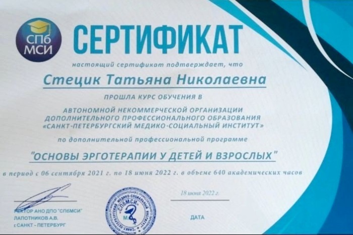 "В Россию эта специальность только приходит и пока эрготерапевтов нет в реестре профессий. Однако в странах Запада эрготерапии широко обучают, а специалисты работают в государственных и частных больницах, домах престарелых, реабилитационных центрах, учреждениях образования. К слову, преподаватели кафедры Социальной реабилитации Медико-социального института отметили серьезную включенность в процесс обучения ивановского педагога и то упорство, с которым Татьяна Стецик осваивала новые знания", – пишет пресс-служба мэрии.