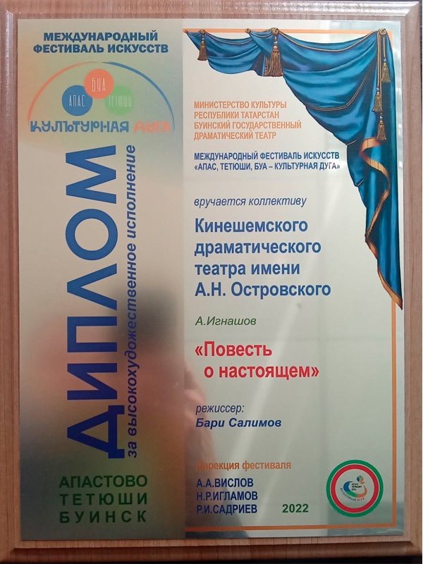 Артисты Кинешемского драматического театра им. А.Н. Островского вернулись с Международного фестиваля искусств "Апас, Тетюши, Буа – культурная дуга", который прошел в Татарстане. Кинешемцы представили публике спектакль "Повесть о настоящем" по пьесе драматурга Александра Игнашова в постановке режиссера Бари Салимова. Об этом сообщается на сайте театра.