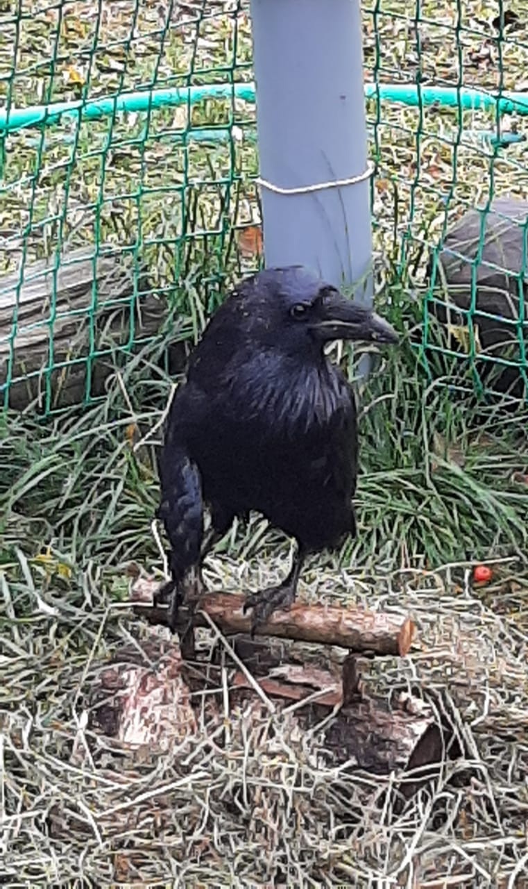 "Я никогда не имела дел с птицами и мало что знала о них. Я нашла его на участке у соседа, который просил в его отсутствие включать поливалку. Это было 30 июня. Большая черная птица с повисшим крылом сидела на стволе яблони, практически лежавшем на земле и внимательно смотрела на меня. Он испугался, но улететь не смог – я поняла, что птица нуждается в помощи", – вспоминает она.