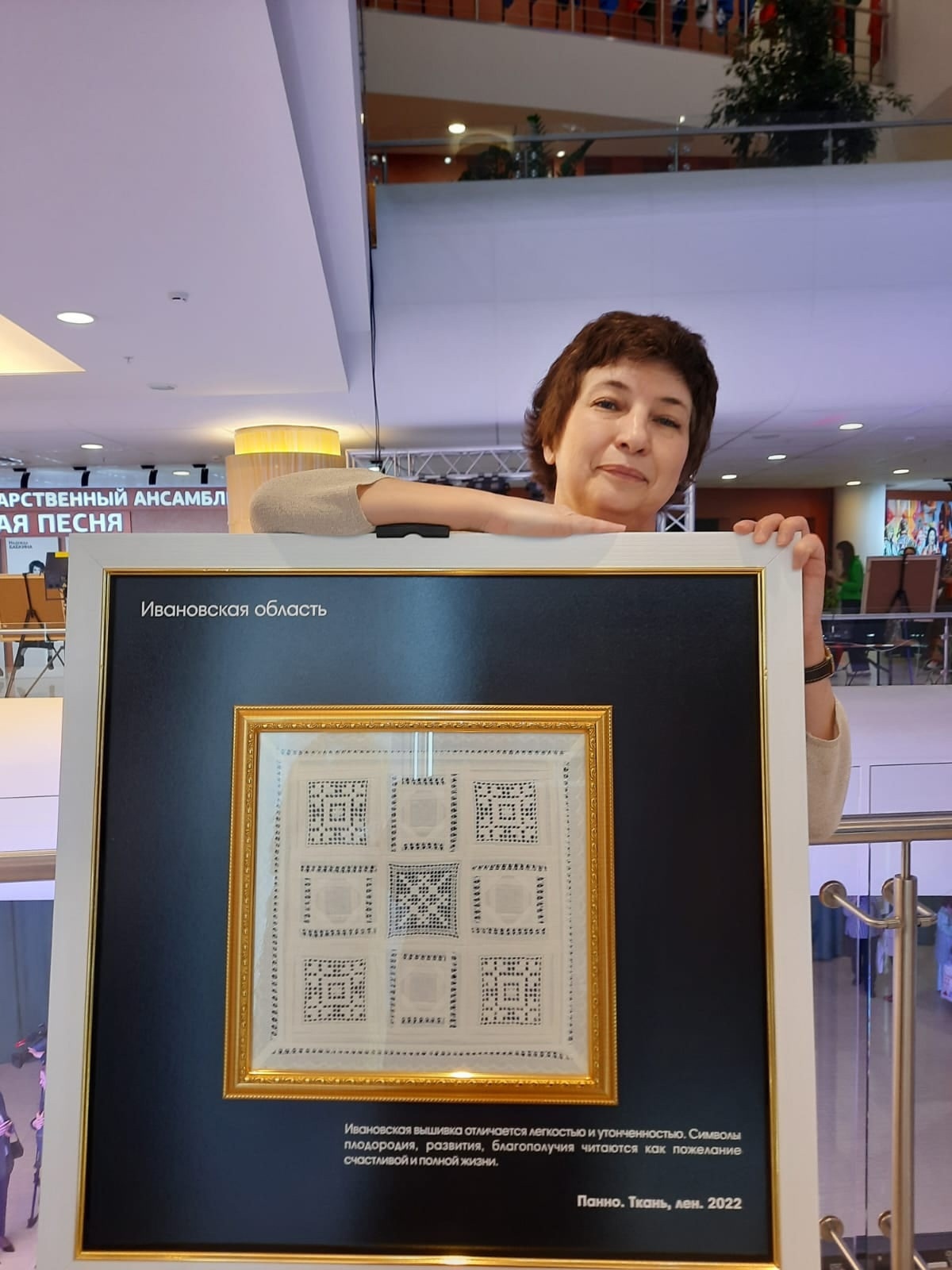 Ивановские мастерицы в Москве, в Театре русской песни Надежды Бабкиной, представили наш регион на "Вышитой карте России". Об этом на своей странице в "ВКонтакте" рассказала руководитель клуба "Лоскутная мозаика" Марина Тулупова – именно она с коллегами в течение нескольких дней готовила кусочек Вышитой карты – Ивановскую область. Фрагмент размером с ладошку они заполнили строчевым орнаментом ивановской вышивки, напоминающей узоры на морозном стекле.