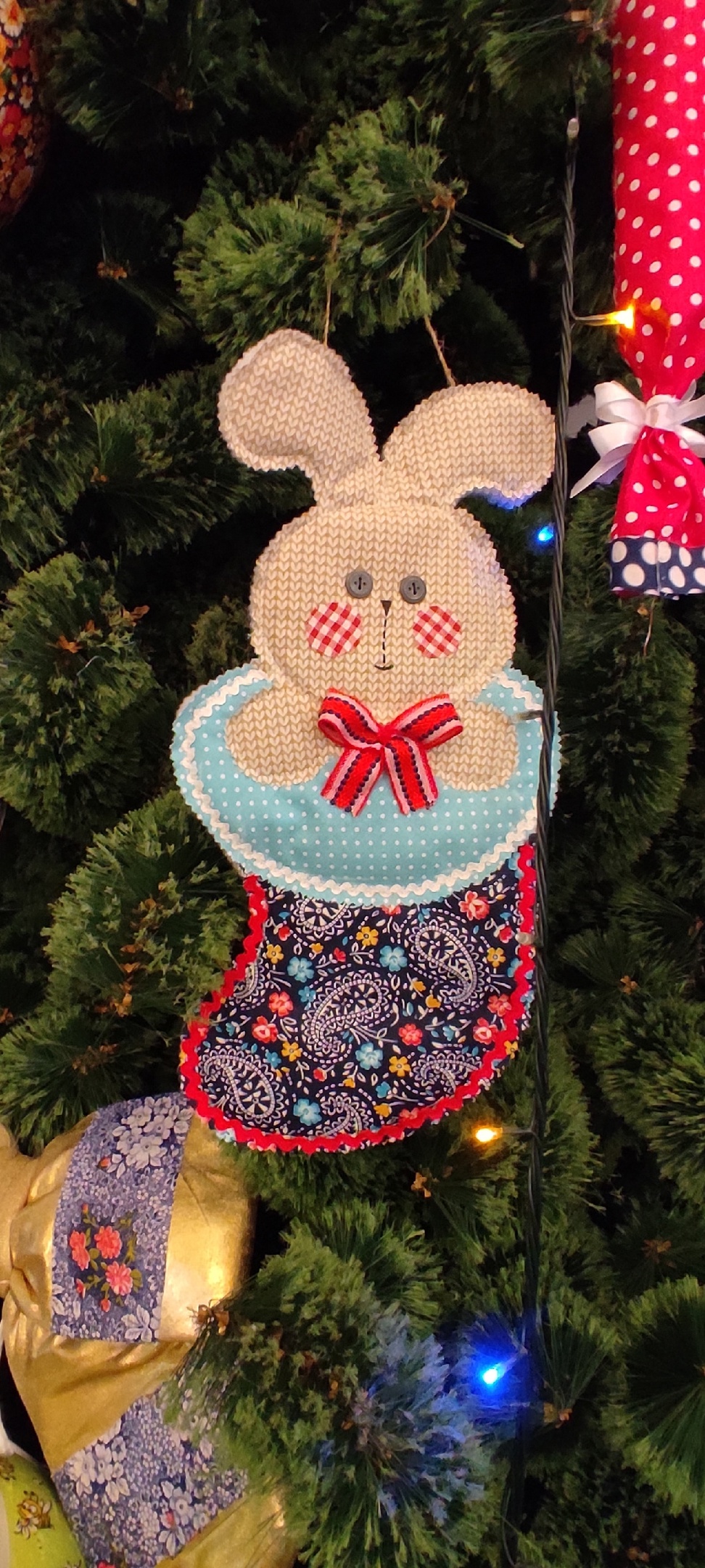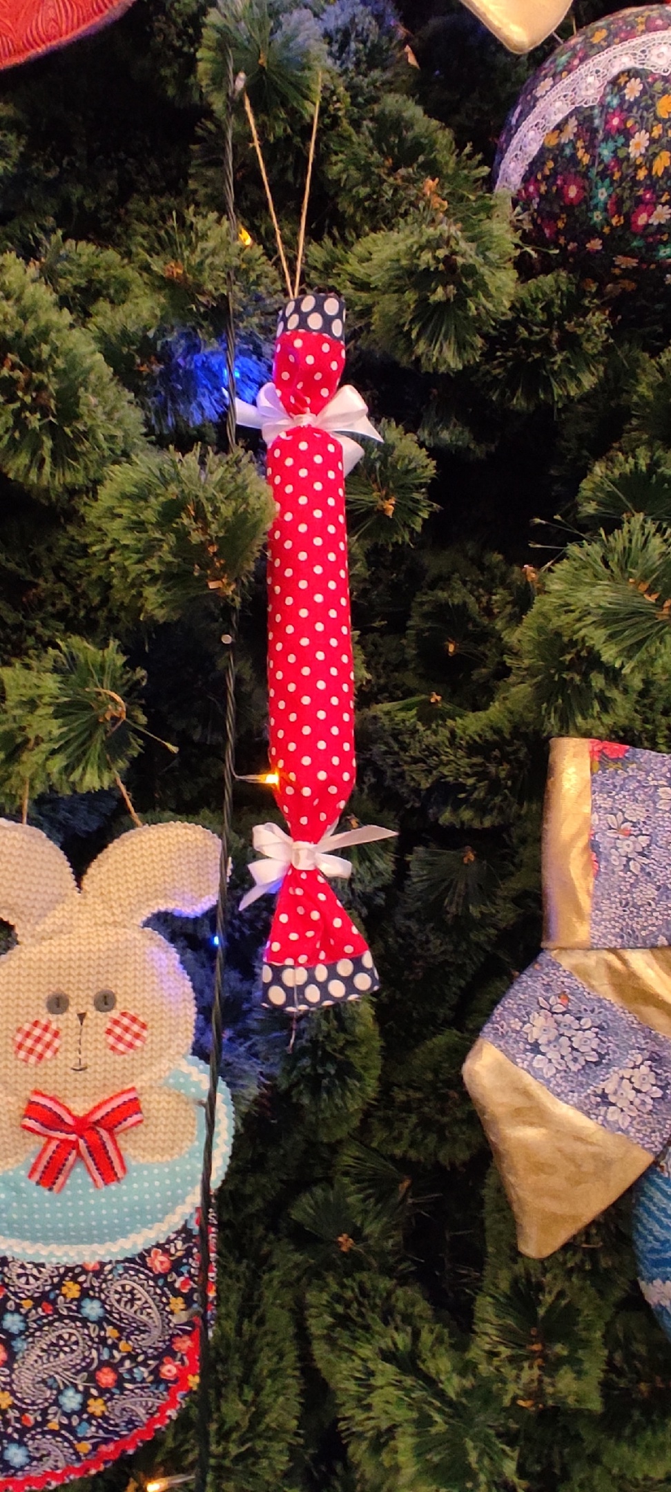 Помимо шаров и бантов елку украсили игрушки из ткани: сова, лошадь, конфета и конечно, символ наступающего года, заяц.