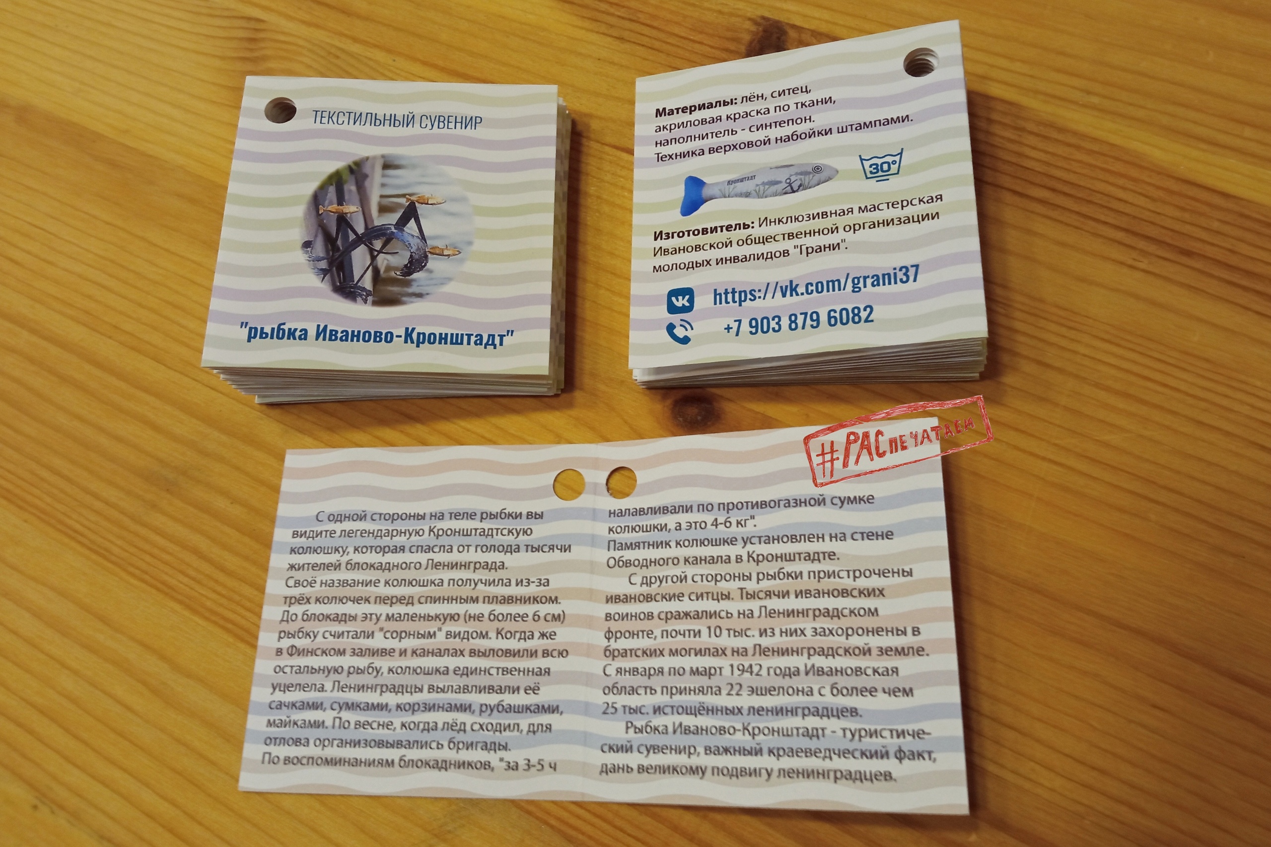 "С другой стороны рыбки пристрочены ивановские ситцы. Тысячи ивановских воинов сражались на Ленинградском фронте, почти 10 000 из них захоронены в братских могилах на Ленинградской земле. Согласно архивным данным, с января по март 1942 года Ивановская область приняла 22 эшелона с более чем 25 000 истощенных ленинградцев", – делятся авторы идеи создания туристических сувениров.