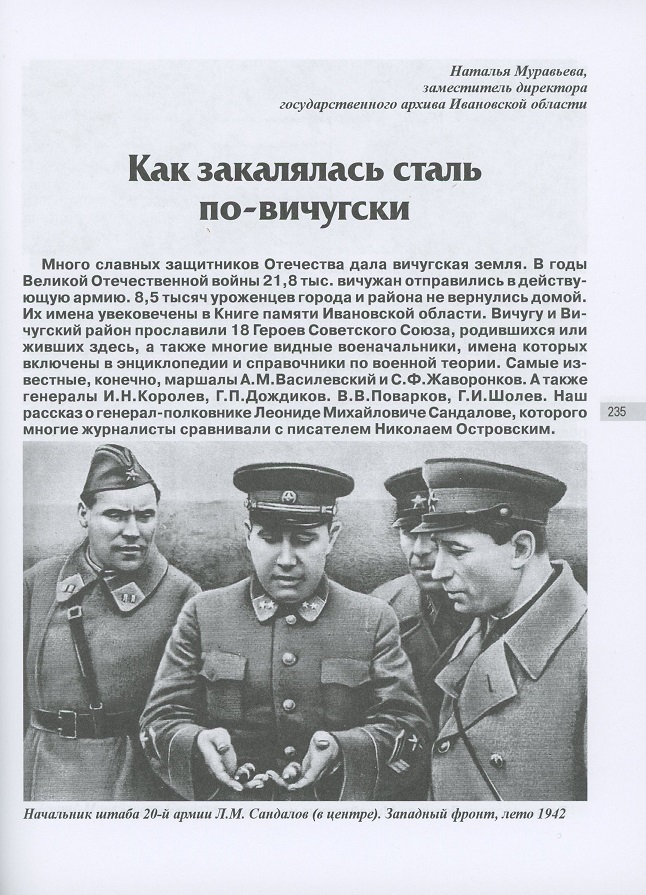 Специалисты архива также поучаствовали в создании книги, поделившись как ранее опубликованными, так и новыми материалами. Например, директор архива Александр Семененко представлен в сборнике статьями "Великий восток и великий запад Александра Коновалова", "Бунт на вичугской земле", заместитель директора Наталья Муравьева – статьями "Победы, радости и беды Маруси Виноградовой", "Как закалялась сталь по-вичугски", "Хозяйка города". Последняя статья написана специально для книги и публикуется впервые. Также в сборнике опубликованы написанная Натальей Муравьевой в соавторстве с начальником отдела специальных фондов и современной документации Еленой Болтуновой статья "Родина маршала Жаворонкова" и статья начальника отдела публикации и использования документов Любови Яблоковой "Служитель культа и просветитель". Маршалу Советского Союза, дважды Герою Советского Союза Василевскому посвящена статья почетного архивиста Ивановской области, ныне покойной Ольги Захаровой "Тайна маршала".