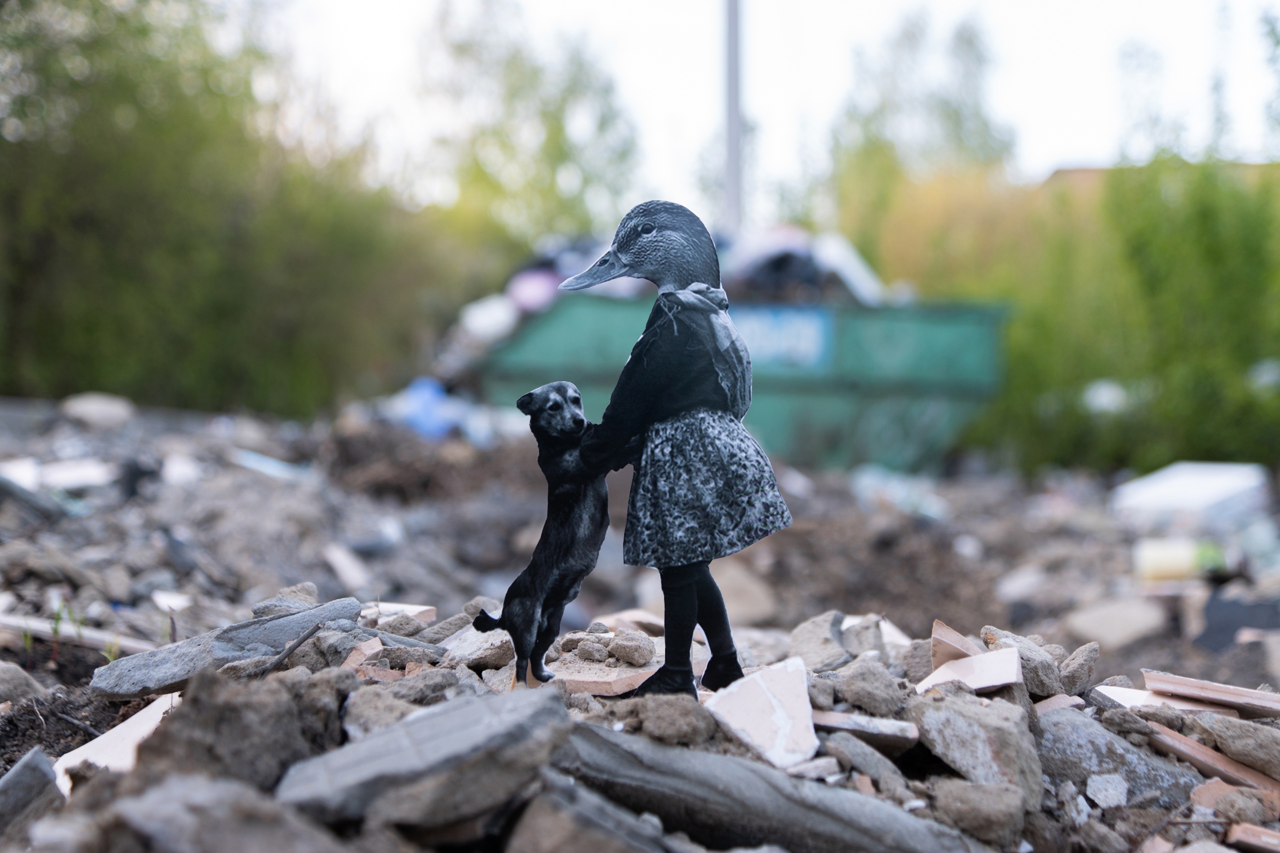 Утки удачно вписались с городскую жизнь. На коллажах авторы изобразили дворника-утку, который приводит улицы города в порядок, кучку ребятишек-уточек, которые играют в песочнице, девочку-уточку, которая резвится с песиком, утку, убирающую квартиру, а также уточку, загорающую в парке.