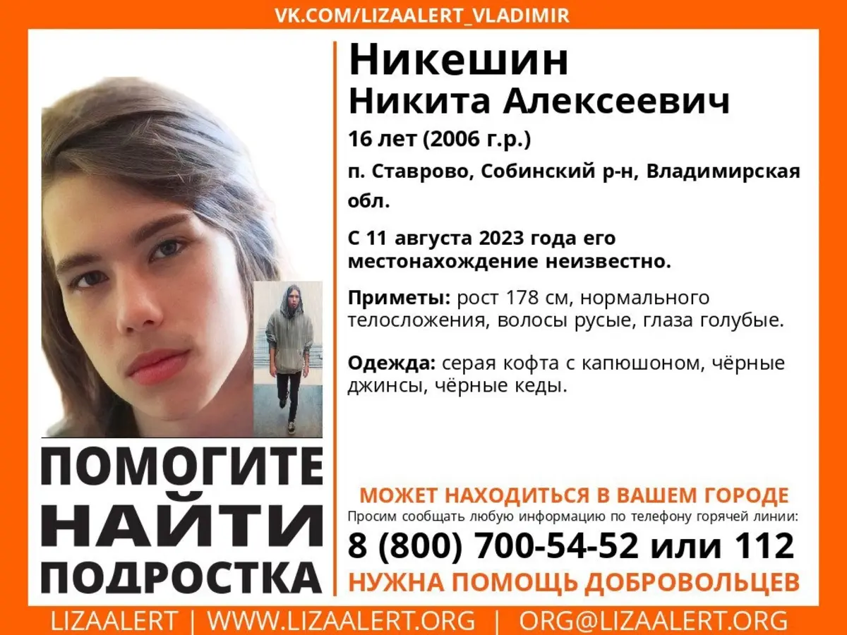 Поисково-спасательный отряд "Лиза Алерт" из Ивановской области сообщил о пропаже 16-летнего жителя поселка Ставрово Владимирской области. Ориентировку пресс-служба разместила в соцсетях.