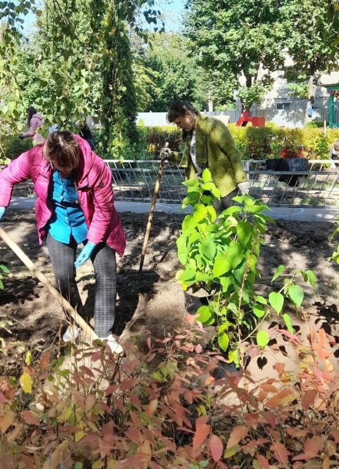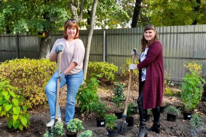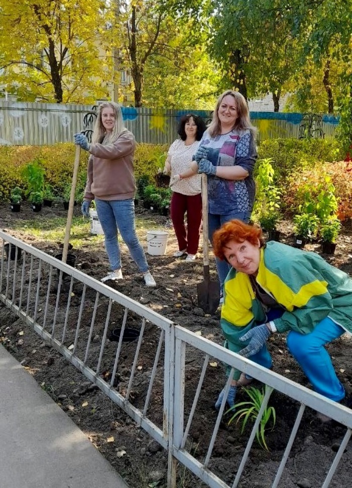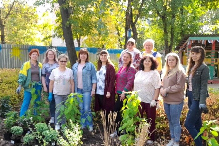 На прошлой неделе воспитатели и актив родителей детского сада высадили на территории древовидные гортензии и группы многолетних травянистых растений: котовника Фассена, очитка видного, флокса метельчатого и калерии сизой. Это будет задний ряд растений. Акцентными для весеннего цветения станут кусты сирени Моник Лемуан. Вдоль центральной дорожки высажен ряд лилейников.