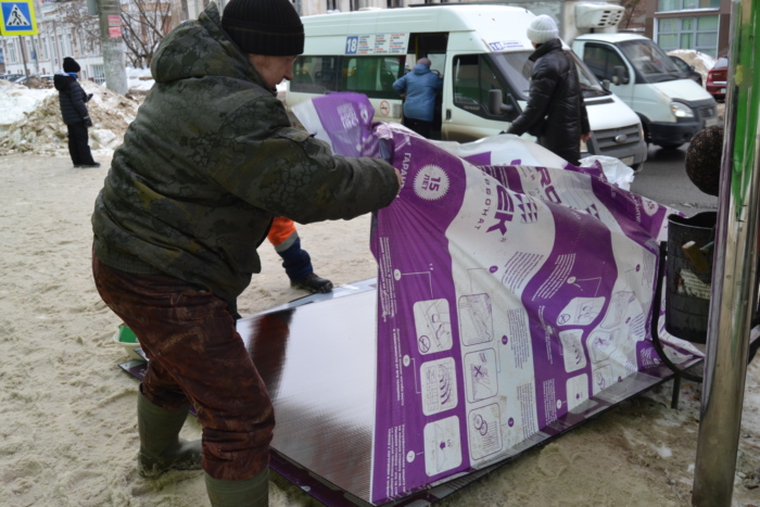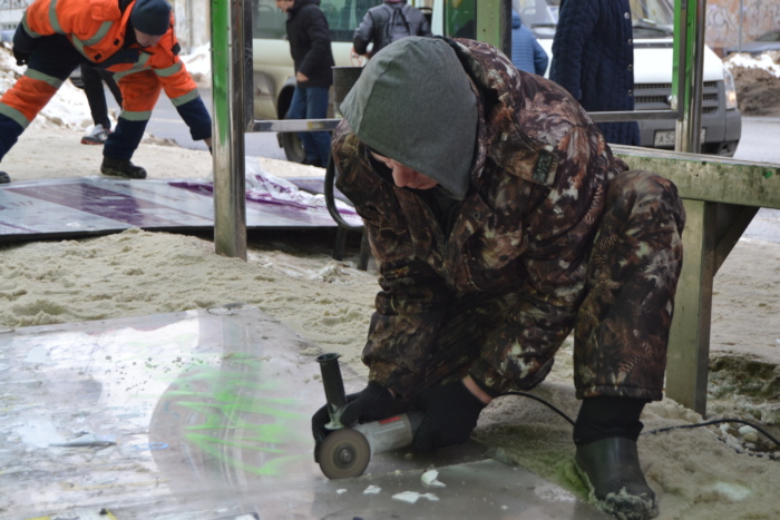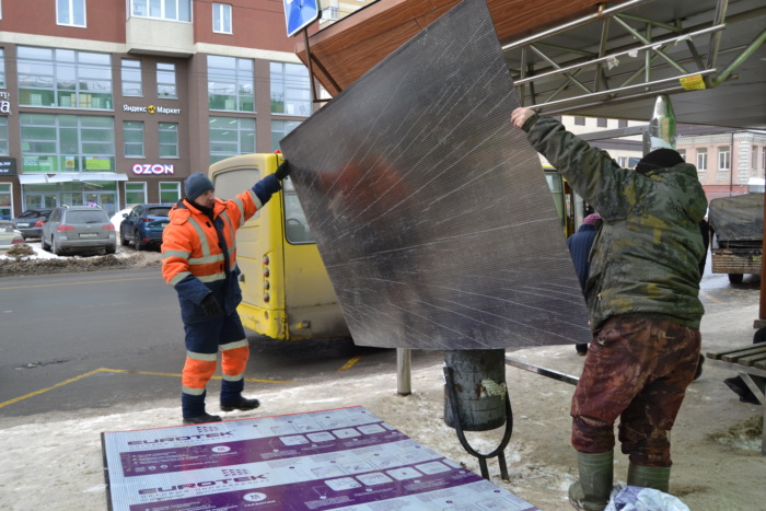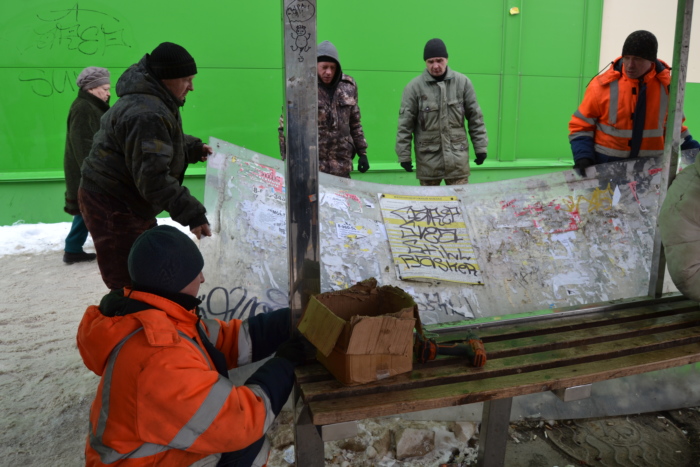 Подрядчик демонтирует поврежденный поликарбонат, которым обшиты остановки, и меняет его на новый, заменяет поврежденный профлист, ремонтирует деревянные скамейки.