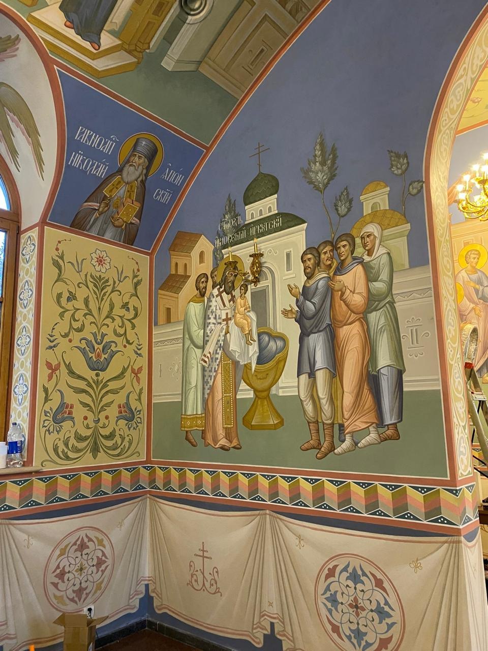 11 самых опытных иконописцев трудились над 500 м² плотной живописи. Стены и своды церкви мастера расписали библейскими сюжетами и образами святых, которых там не было даже после строительства в начале XX века. Дополнительным усложнением задачи стали вентиляционные системы, расположение которых необходимо было учесть при создании росписей.