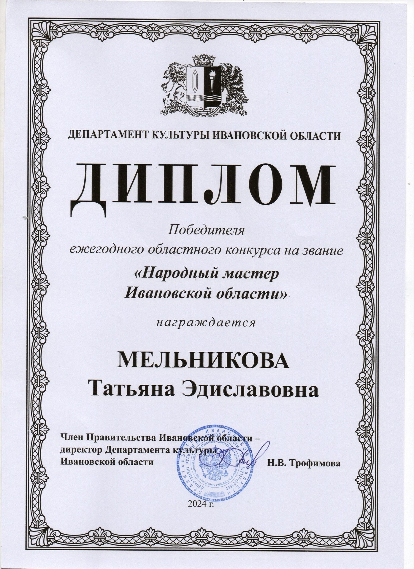 Народным мастером Ивановской области стала специалист по росписи по дереву из Гаврилова Посада Татьяна Мельникова. Удостоверение и диплом она получила на областном форуме работников культурно-досуговых учреждений, сообщает Центр культуры и творчества.