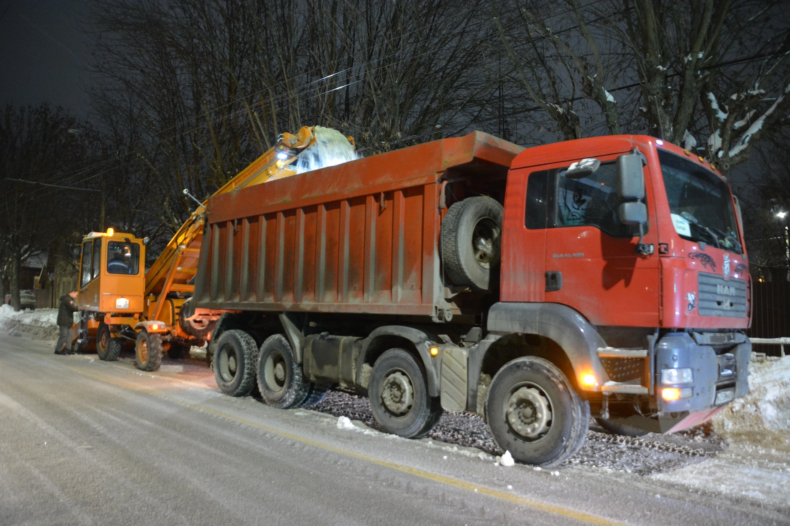 Мастер МКУ "Дорожное городское хозяйство" Андрей Лукошечков рассказал: "Ночная смена длится с восьми вечера до восьми утра. За это время каждое механизированное звено проходит по 6–7 улиц. Сначала грейдер формирует вал, лаповый снегопогрузчик загружает снегом самосвалы. Он работает быстрее, чем фронтальный погрузчик. После прохождения лапового снегопогрузчика проезжую часть дометают трактора".