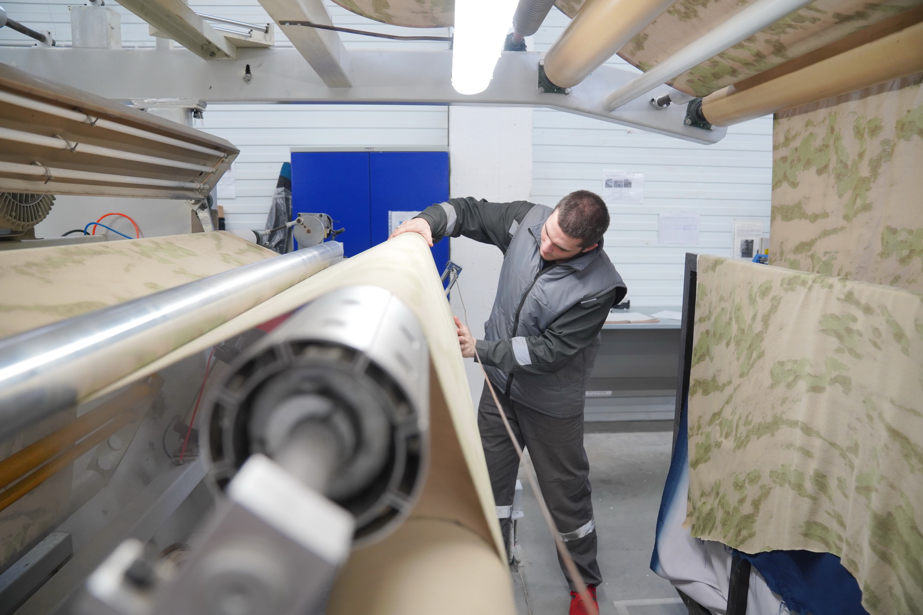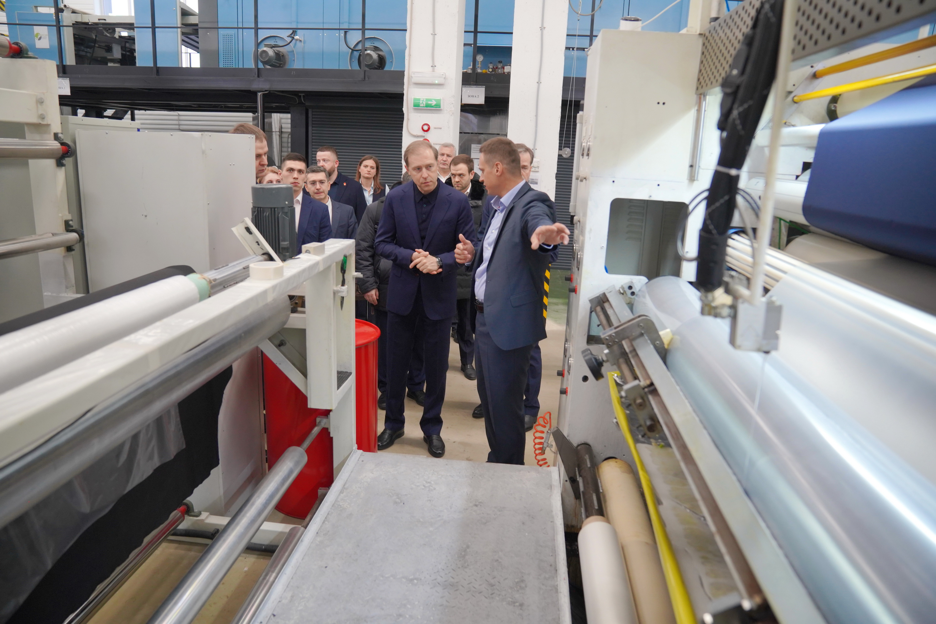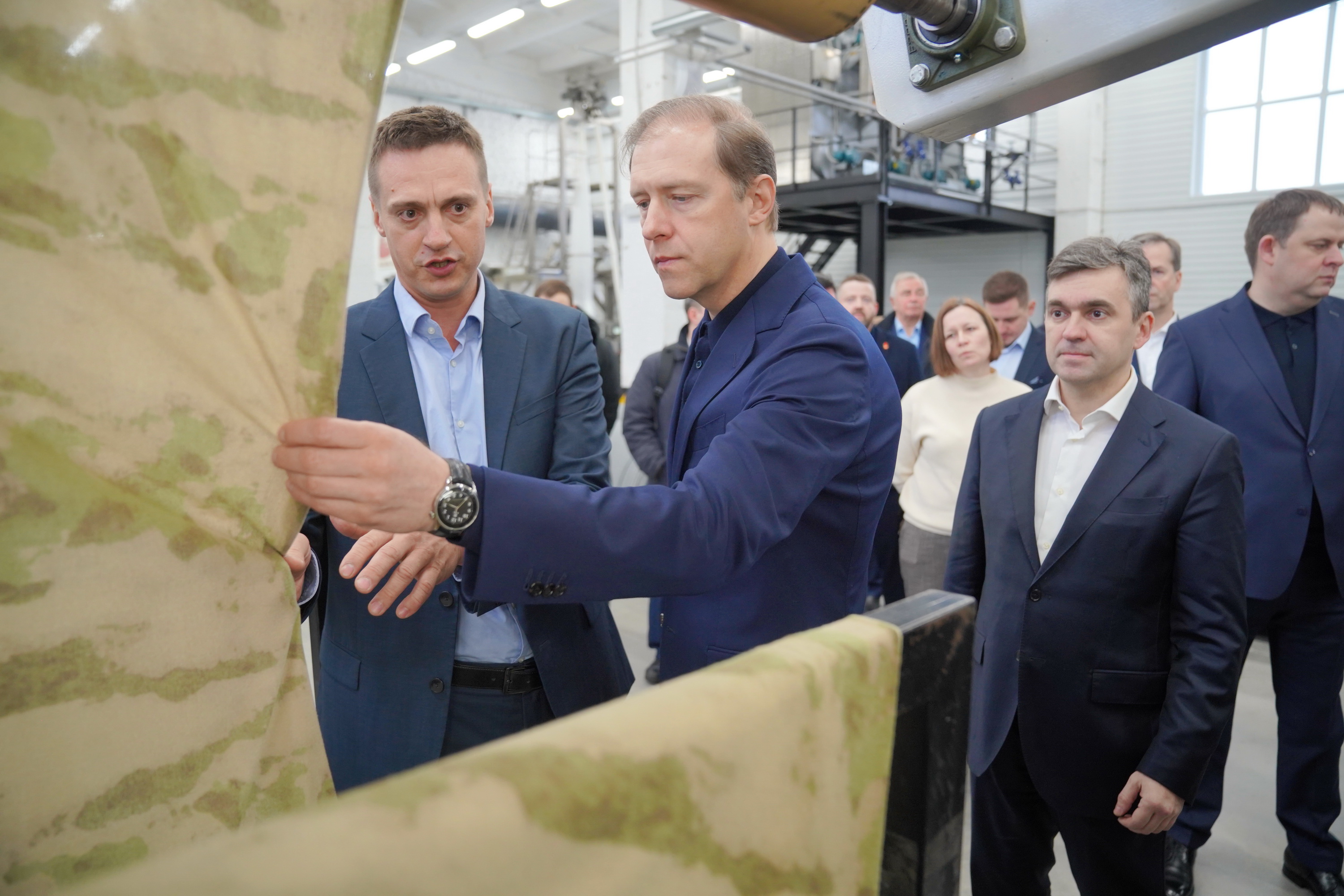 Также первый вице-премьер посмотрел и технологию производства мембранных тканей. В компании работают три линии нанесения мембранного слоя на основную ткань, одна из которых запатентована по собственным технологиям. Процесс изготовления ткани также включает крашение и нанесение рисунка – тоже по собственной технологии.