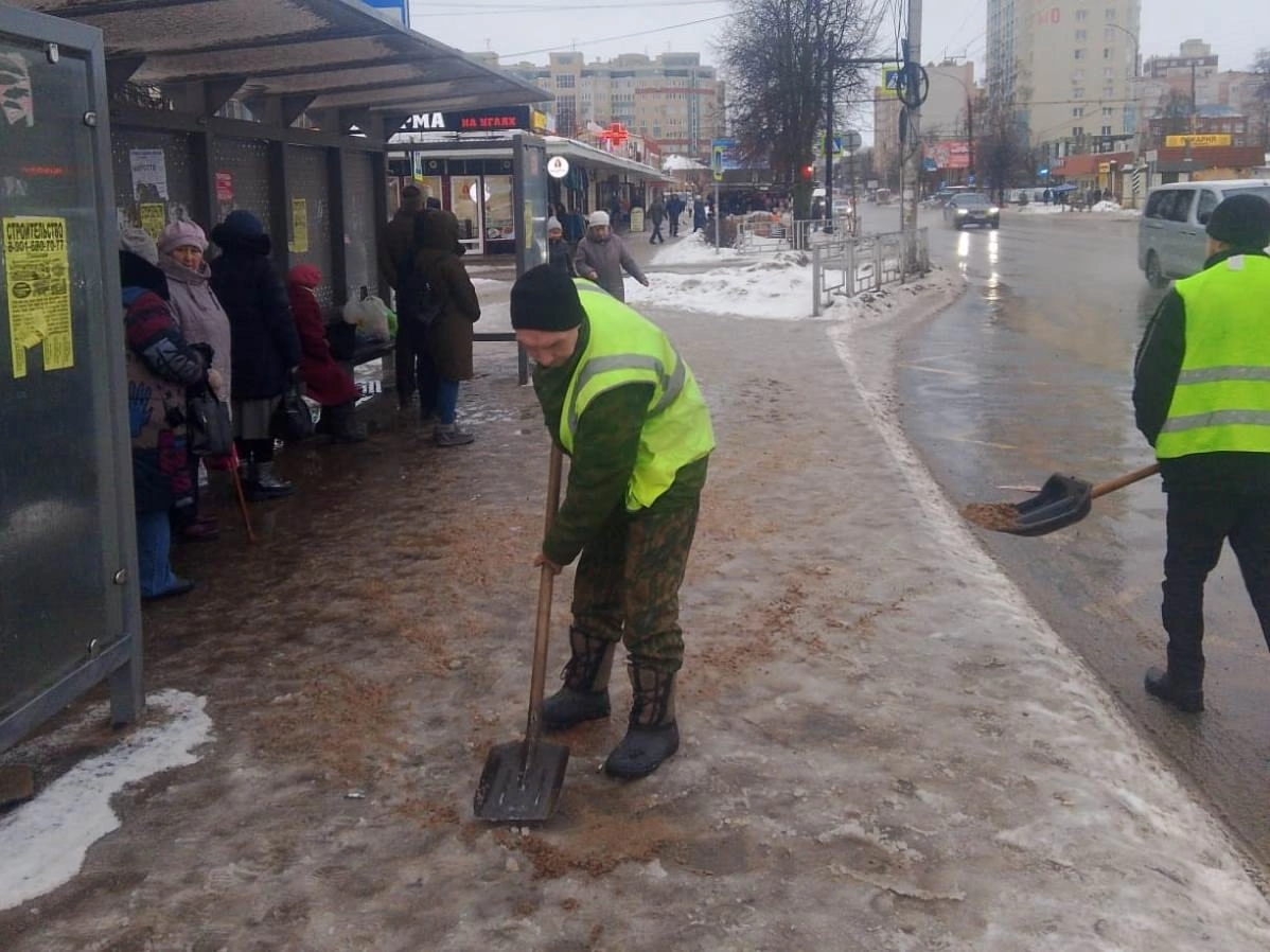 Бригады рабочих очищают и обрабатывают тротуары, подходы к пешеходным переходам и остановки общественного транспорта противогололедными материалами.