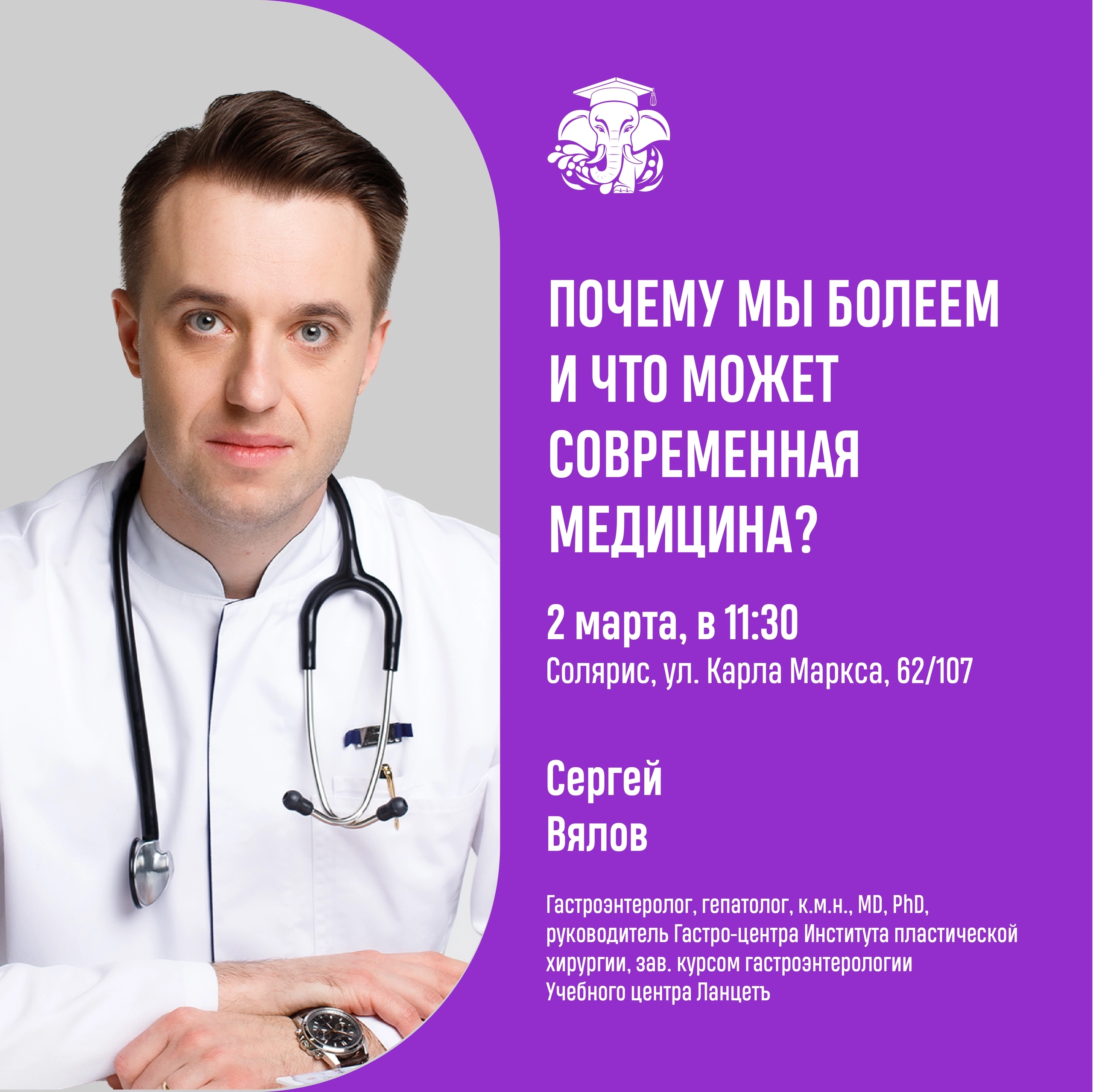 В образовательном центре "Солярис" с лекцией "Почему мы болеем и что может современная медицина?" (14+) выступит Сергей Вялов, известный гастроэнтеролог и гепатолог, поделились создатели проекта в соцсетях.