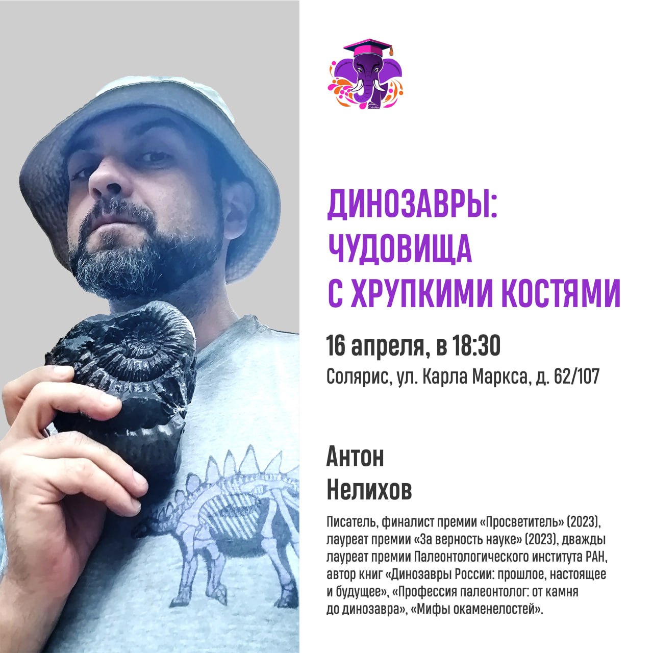 В среду, 16 апреля, в образовательном центре "Солярис" писатель, лауреат Палеонтологической премии РАН Антон Нелихов выступит с лекцией "Динозавры: чудовища с хрупкими костями" в рамках проекта "СЛОН", сообщила пресс-служба правительства Ивановской области. Лекция начнется в 18:30.