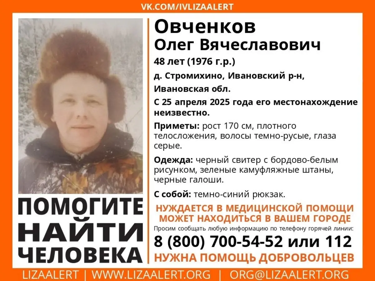 Олег Вячеславович Овченков 1976 года рождения пропал 25 апреля из деревни Стромихино Ивановского района. Он ростом 170 см, плотного телосложения, с темно-русыми волосами и серыми глазами. Мужчина был одет в черный свитер с бело-бордовым рисунком, зеленые камуфляжные штаны и черные галоши. С собой у пропавшего был темно-синий рюкзак. Добровольцы добавляют, что пропавшему нужна помощь медиков. Он может находиться в любом городе региона.