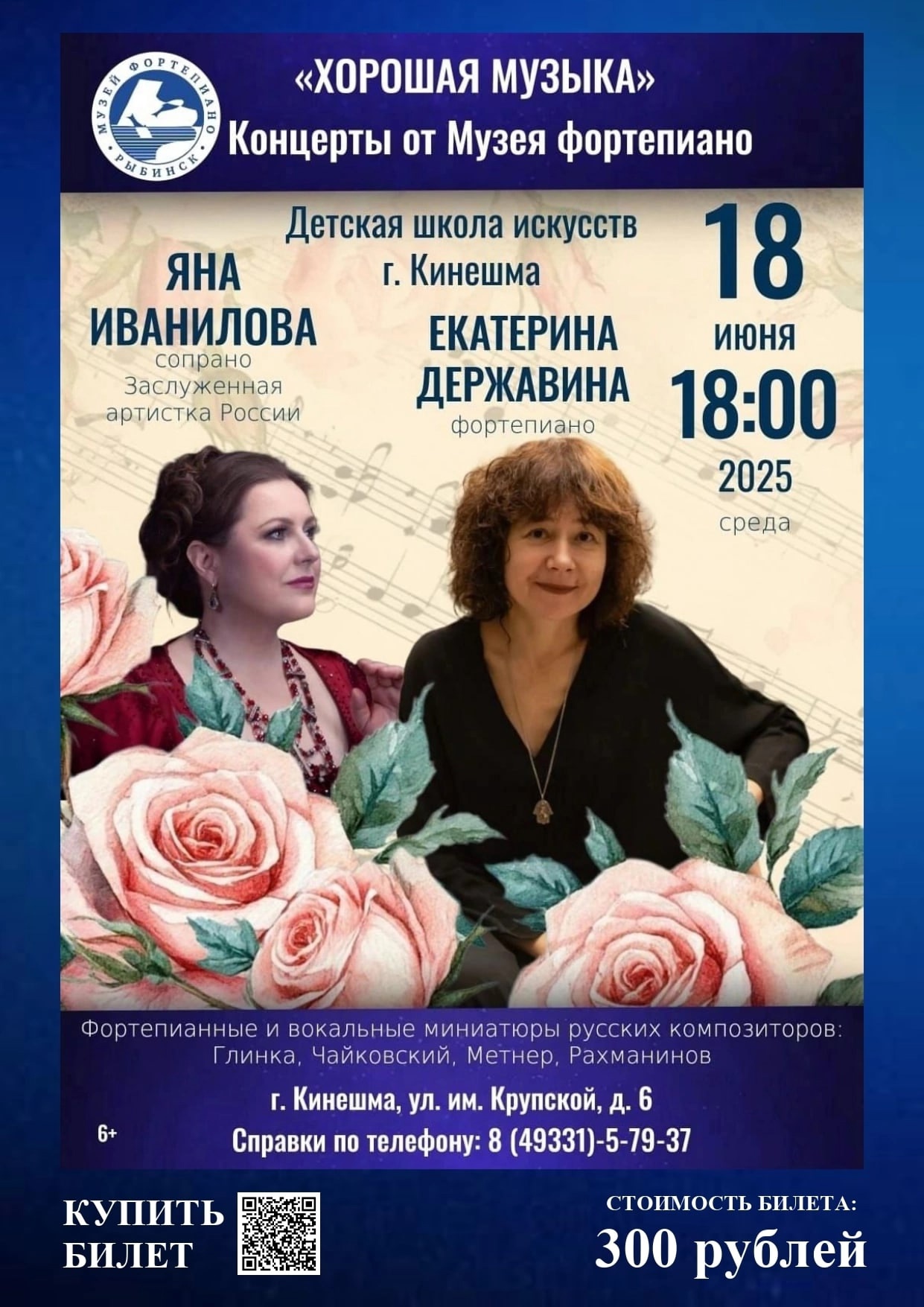 В среду, 18 июня, в 18:00 в кинешемской Детской школе искусств выступят лауреаты международных конкурсов – заслуженная артистка России Яна Иванилова (сопрано) и Екатерина Державина (фортепиано), сообщает администрация Кинешмы в соцсетях.