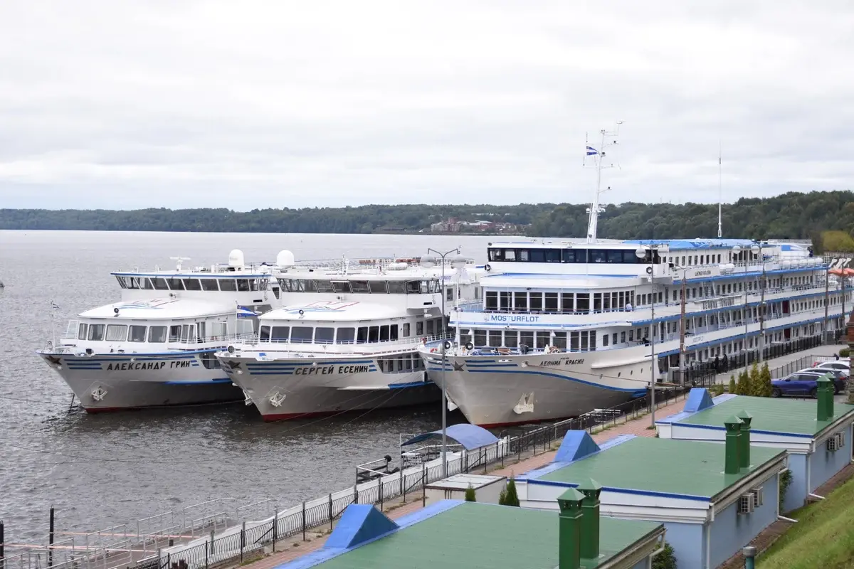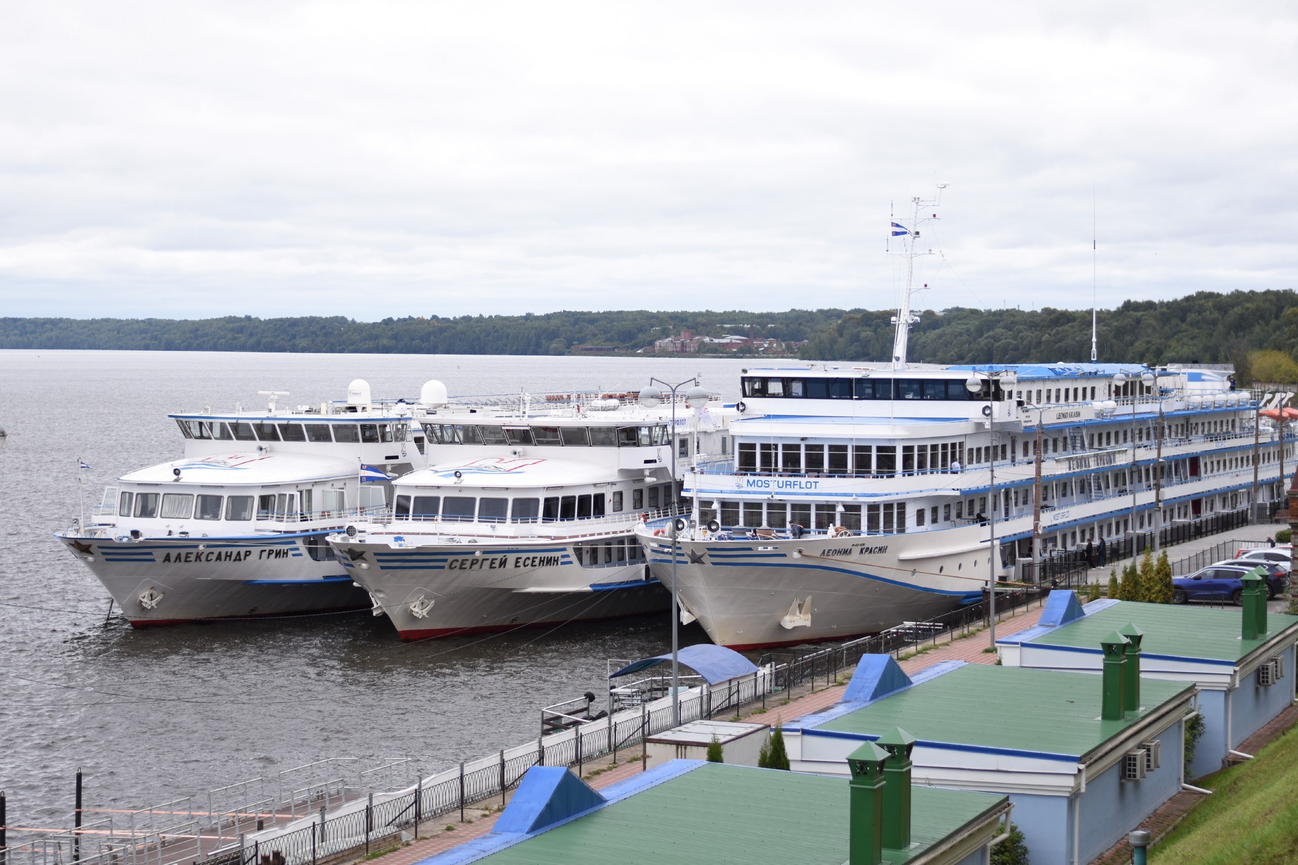 В четверг, 4 сентября, в Кинешме зашвартовались сразу три комфортабельных теплохода: четырёхпалубник "Леонид Красин" и два трехпалубника "Сергей Есенин" и "Александр Грин".