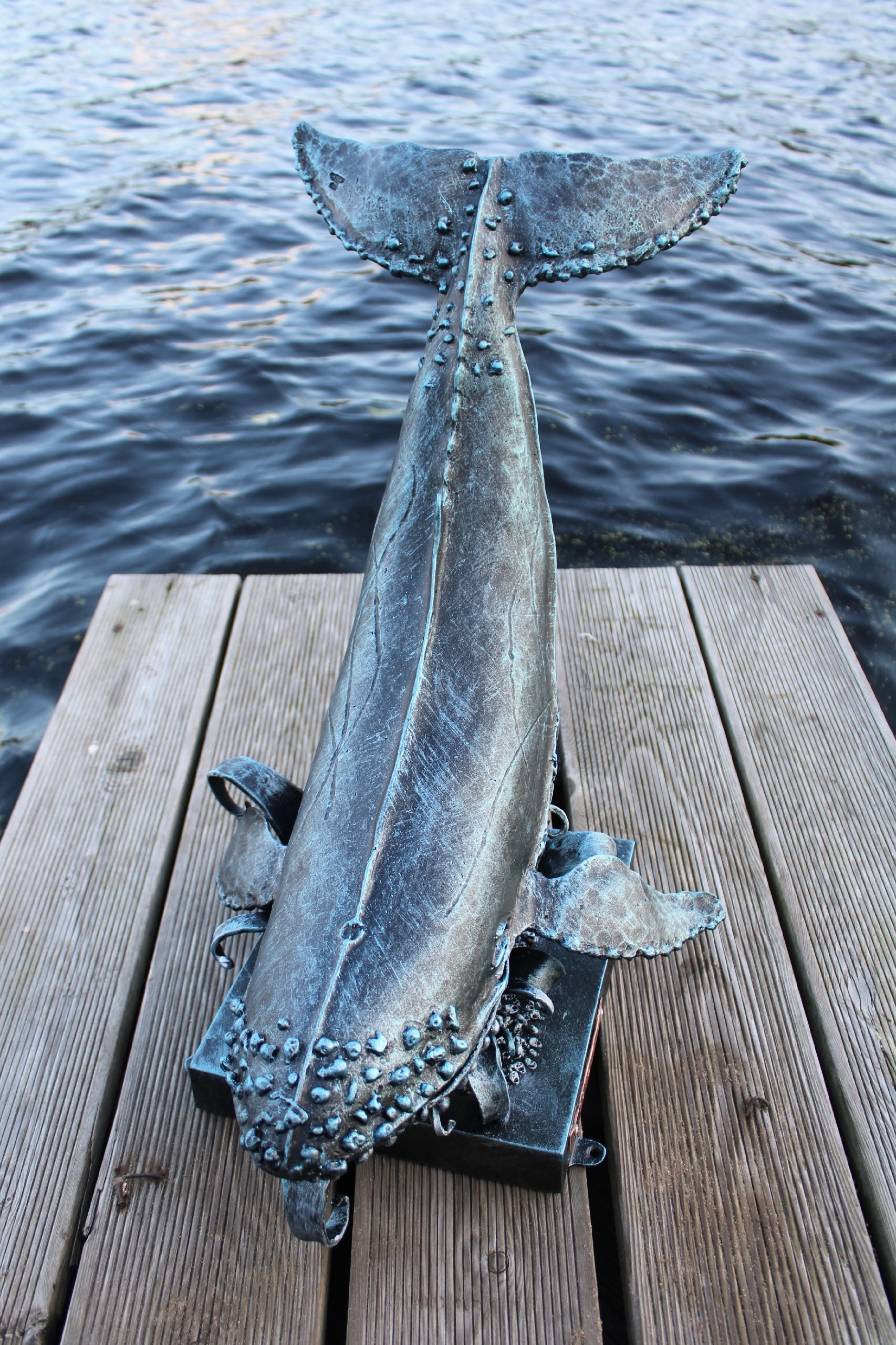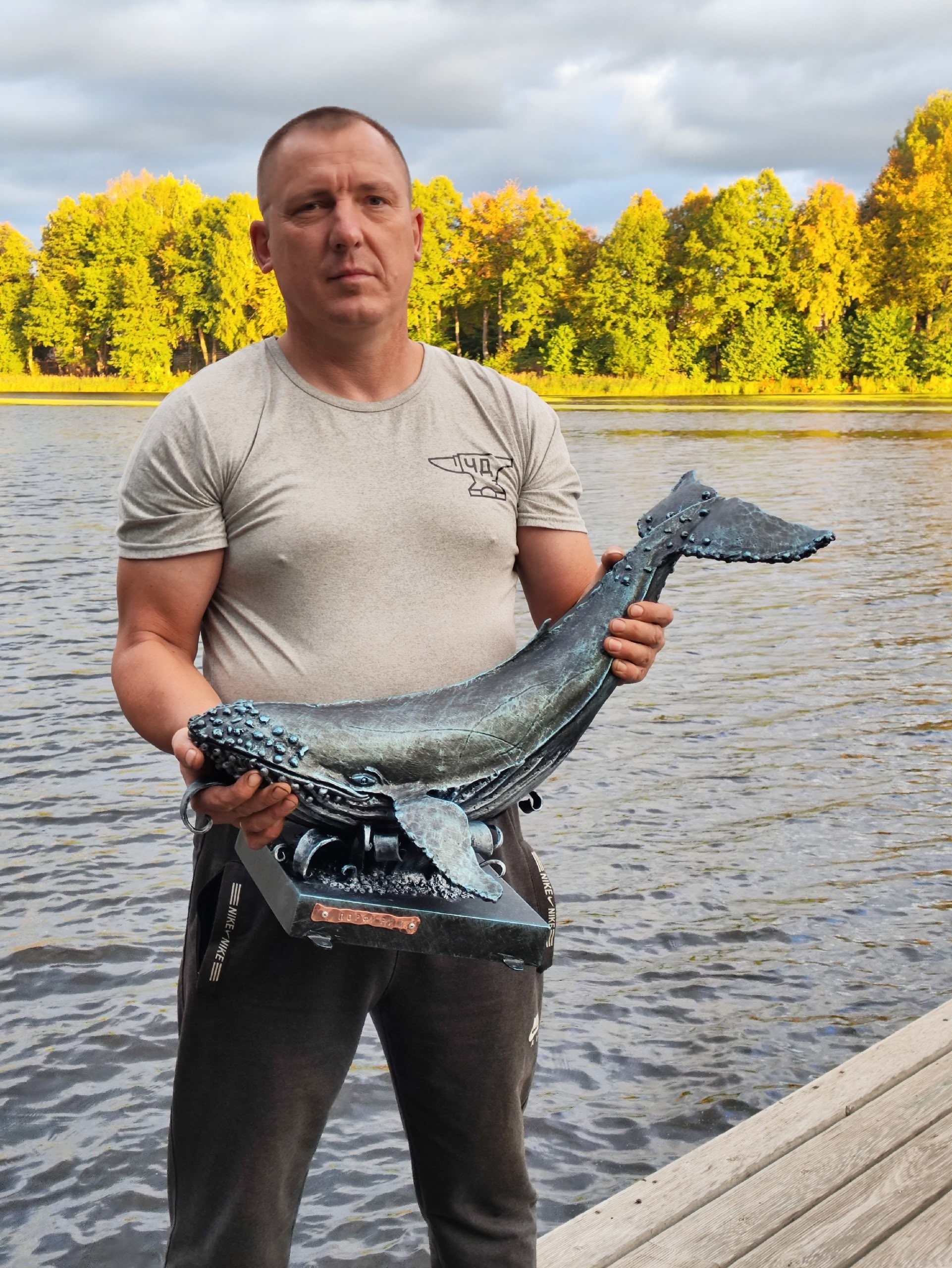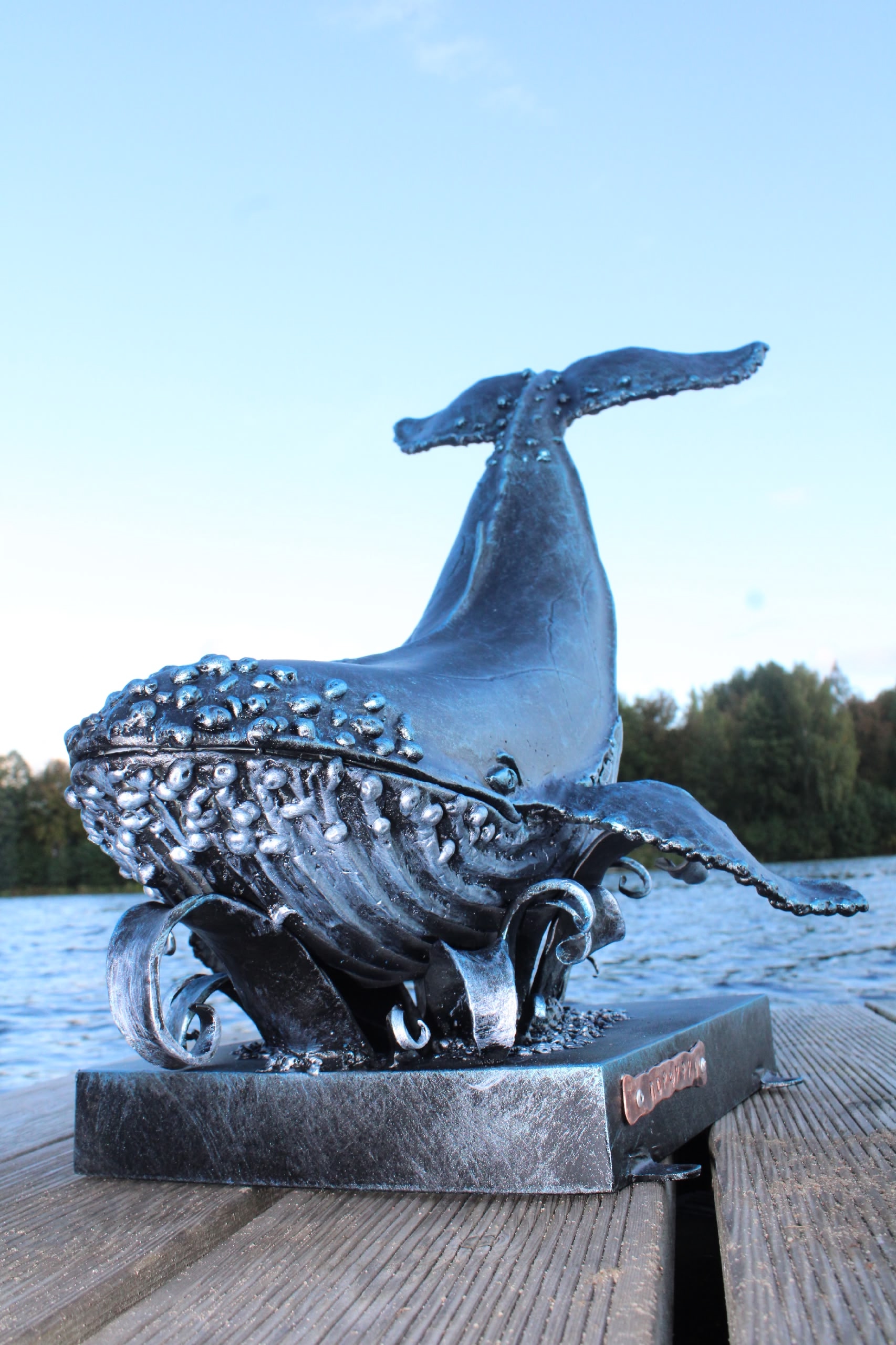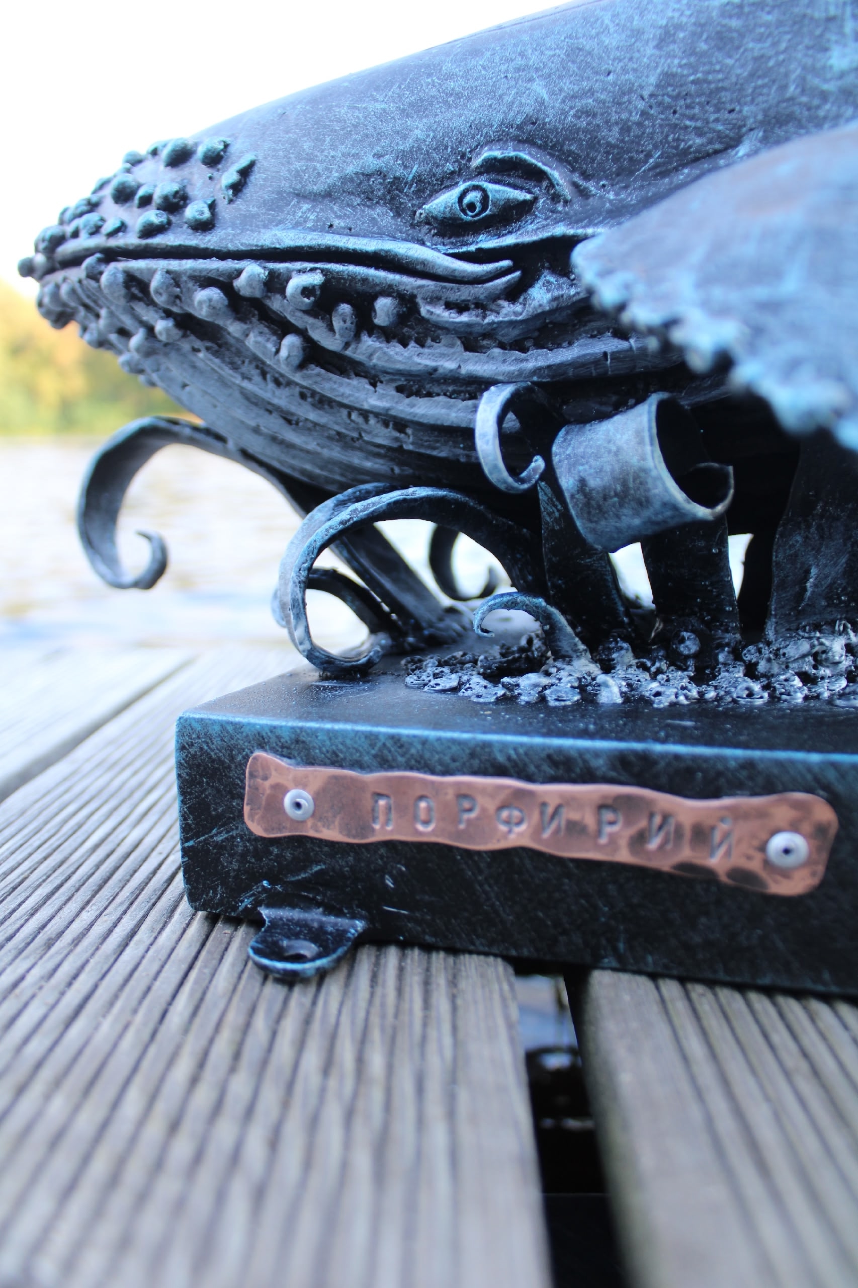 Изготовить кита из металла оказалось непросто, но интересно, – сначала кузнец собрал каркас, варил его проволочка к проволочке, затем заваривал сваркой, зачищал, шлифовал и красил. Кит получился как настоящий, только в миниатюре. Он не просто лежит – он гордо возвышается на волнах и на почетной подставке, где на медной табличке красуется его имя – Порфирий.