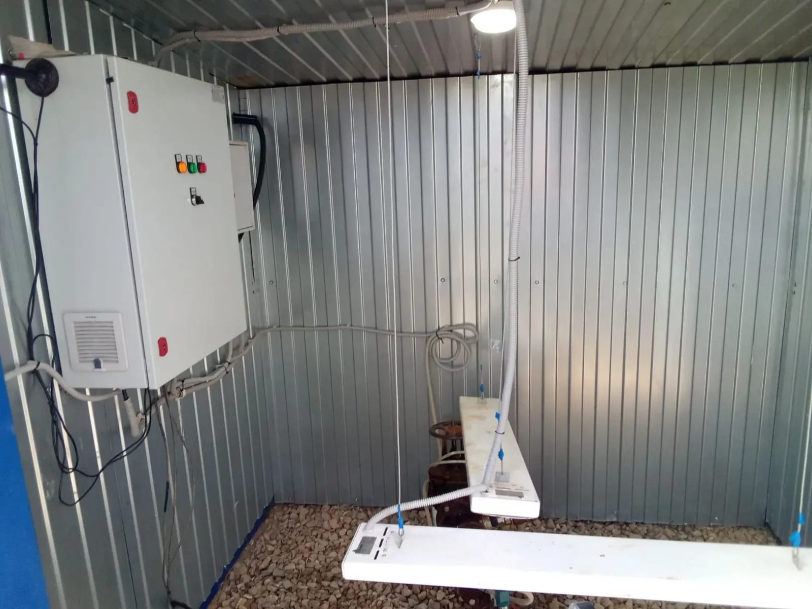 Внутри располагается оборудование по управлению скважинным насосом, там же сотрудник берет пробы воды и проводит работы по обслуживанию насосного оборудования.