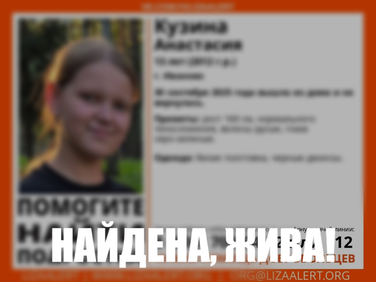 Пропавшая 30 сентября 13-летняя Анастасия Кузина из Иванова нашлась. Она жива. Об этом сообщили добровольцы поисково-спасательного отряда "ЛизаАлерт" в "ВКонтакте".