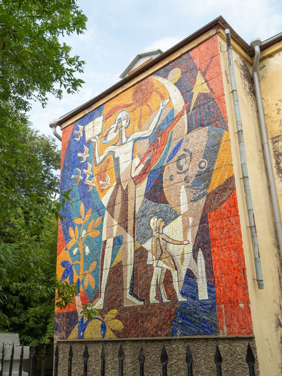 Кстати, здание легко узнать не только по особой архитектуре, но и по мозаичным панно на стенах.