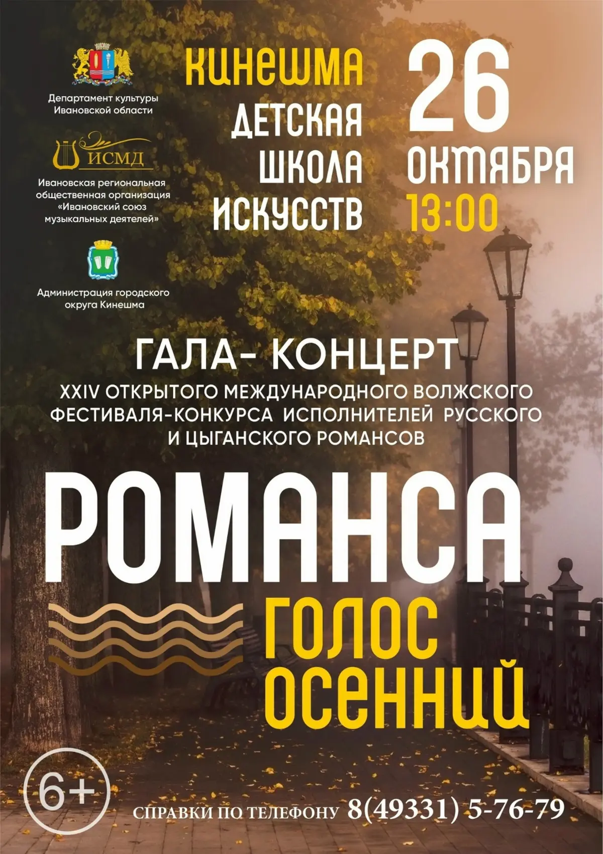 Гала-концерт XXIV открытого международного волжского фестиваля-конкурса исполнителей русского и цыганского романсов "Романса голос осенний" (6+) пройдет в Кинешме в воскресенье, 26 октября, в Детской школе искусств. Начало в 13:00, сообщает мэрия.