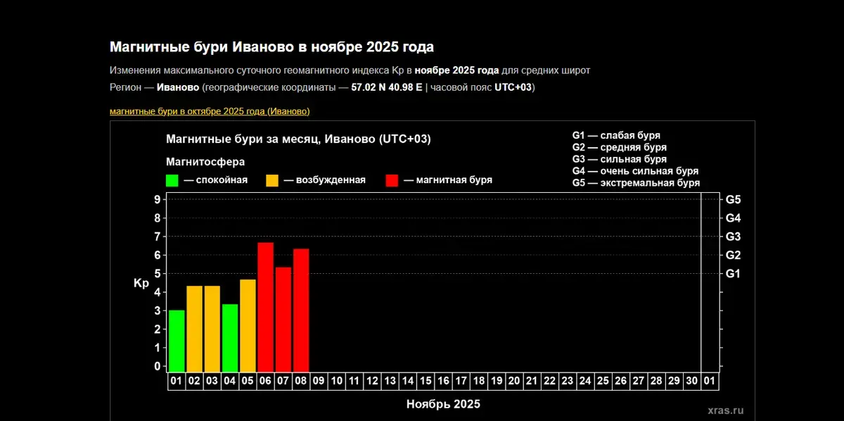 Уровень бури составил G2 – это средняя категория, но уже на грани с сильной. Вызвали ее солнечные вспышки 5 и 6 ноября: Землю задел край выброшенного с Солнца плазменного облака, тогда как основная его часть прошла мимо. На фоне этого с 6 по 8 ноября наблюдались самые интенсивные возмущения за последние пять недель – предыдущий подобный всплеск был 1–3 октября.