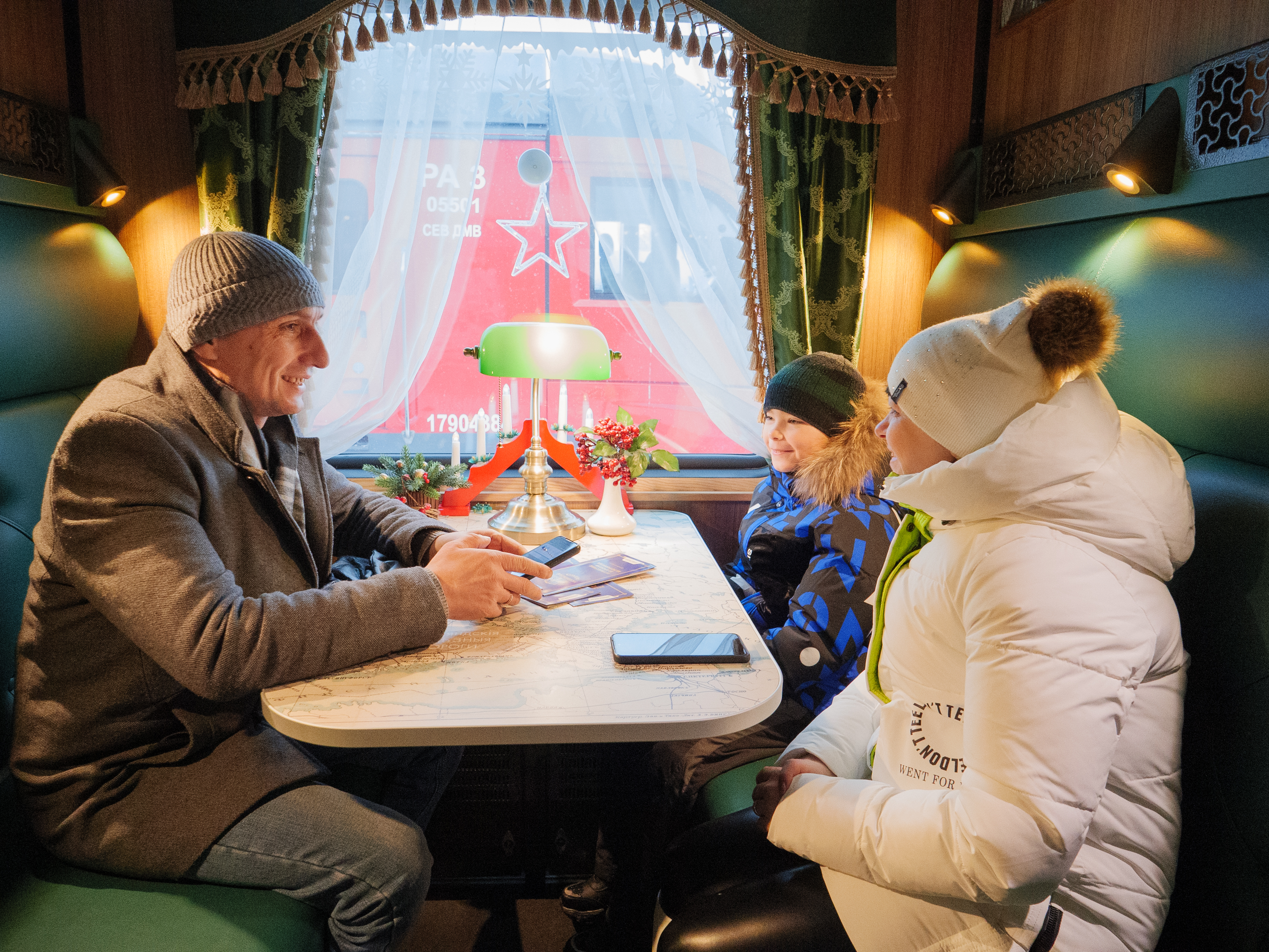 В стандартную программу (стоянка более трех часов) входят или квест с командой аниматоров плюс чаепитие в вагоне-ресторане, или 45-минутное кукольное представление «Волшебная книга сказок. Проделки Снежной королевы».