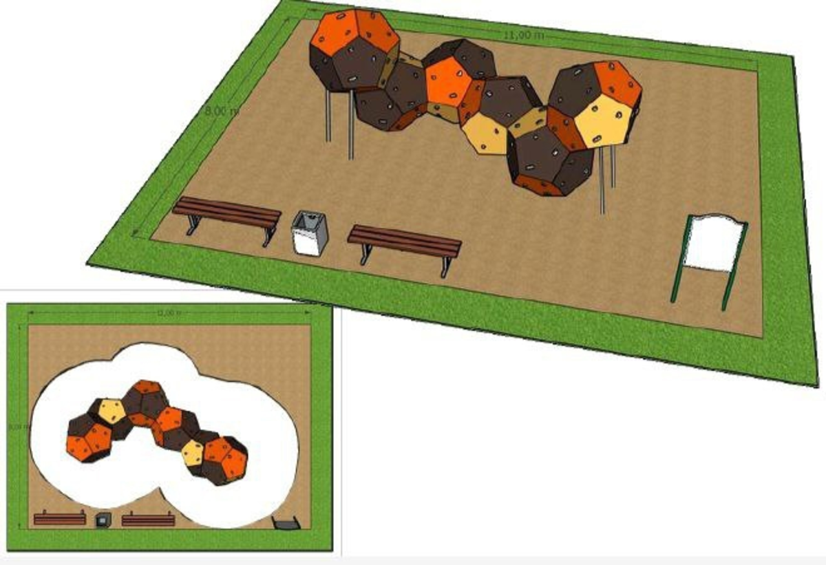 Инициативная группа представила свой эскиз будущего скалодрома: это шесть шестигранных объектов разной высоты в центре и безопасная зона вокруг них, покрытая песком. Для комфорта посетителей на площадке будут предусмотрены две лавочки, урна и информационный щит.
