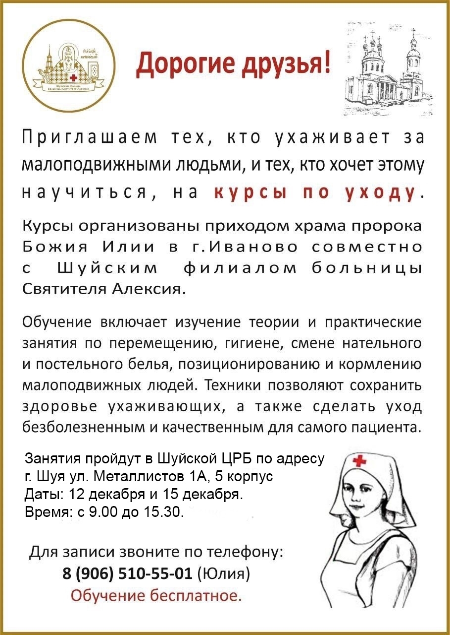 Курсы организует приход храма пророка Илии совместно с Шуйским филиалом больницы Святителя Алексия. Обучение включает теорию и практику по перемещению, гигиене, смене белья, кормлению тяжелобольных. Знание техник позволяет сохранить здоровье ухаживающих, а также сделать уход безболезненным для пациента.
