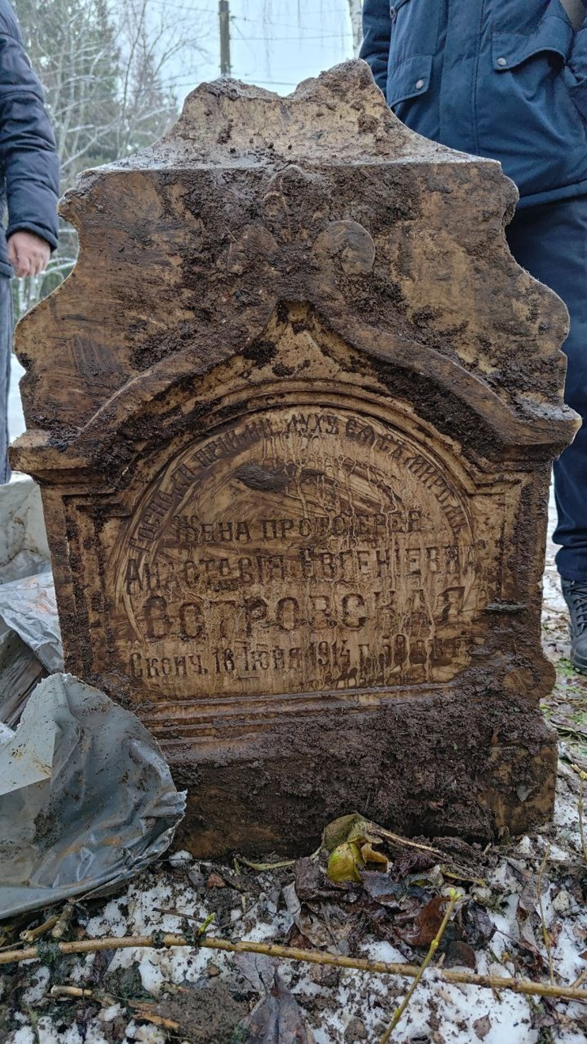 На участке дома в Плесе, принадлежавшего семье местного врача-хирурга Евгения Лебедева, строители обнаружили закопанный в земле надмогильный памятник. По выбитым на камне надписям узнали, что памятник стоял над могилой Анастасии Островской, жены протоиерея, настоятеля Троицкого храма Константина Островского, умершей в 1914 году в возрасте 59 лет. Об этом рассказала пресс-служба Плесского музея-заповедника в "ВКонтакте", куда сообщили о находке.