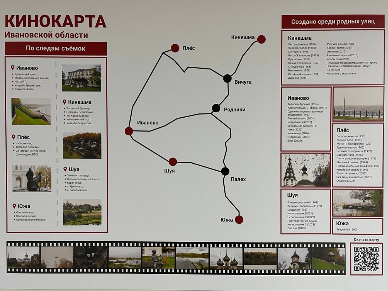Прошло почти 100 лет с момента создания первой киноработы, снятой в Ивановской области – "Бесприданницы" Якова Протазанова 1936 года. Многие локации городов, таких как Иваново, Шуя, Кинешма, Плес, Южа, вошли в киноленты разных режиссеров: "Почти смешная история" Петра Фоменко, "Овсянки" Алексея Федорченко, "Ника" Василисы Кузьминой и многие другие.