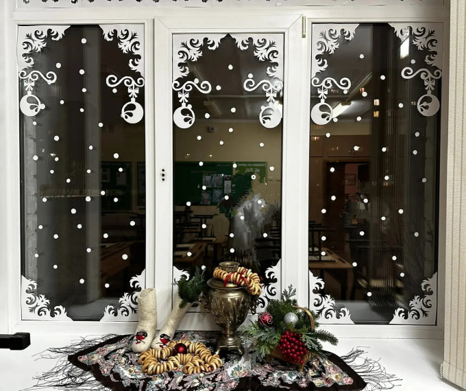 Настроение создают нарядные окна с причудливыми узорами, световые инсталляции, праздничные композиции на входах и в фойе.