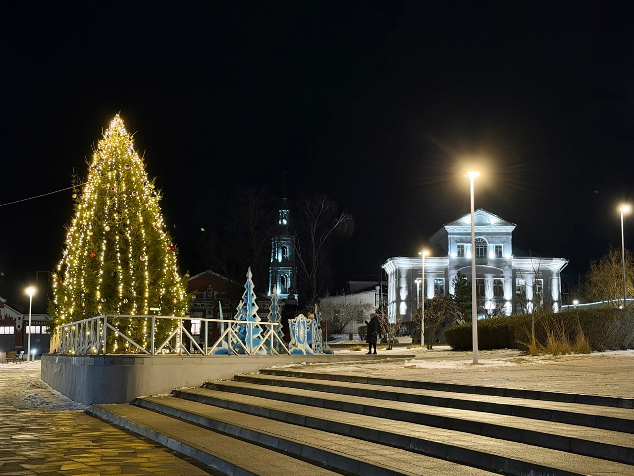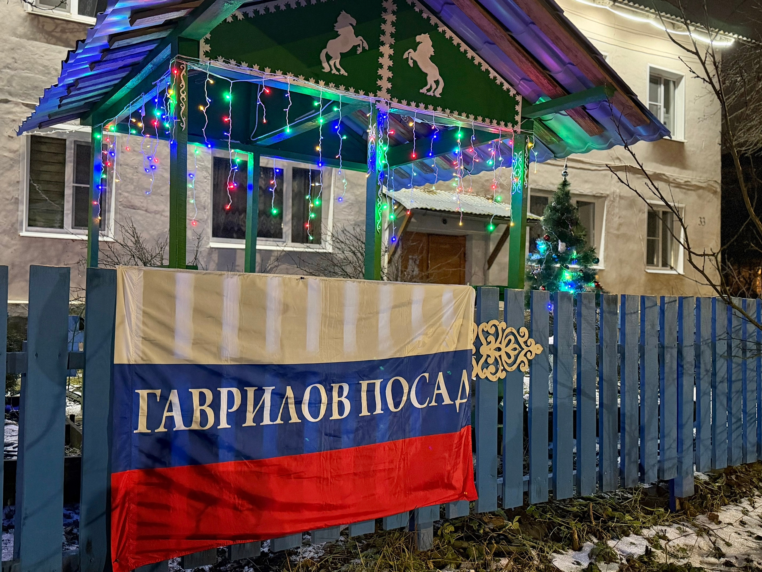 В вечернее время с подсветкой украшенный Гаврилов Посад смотрится ярко и сказочно.