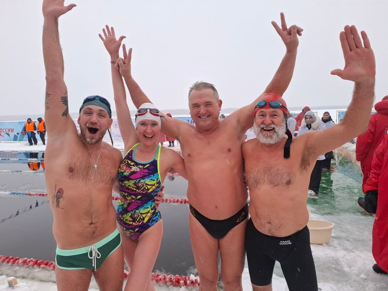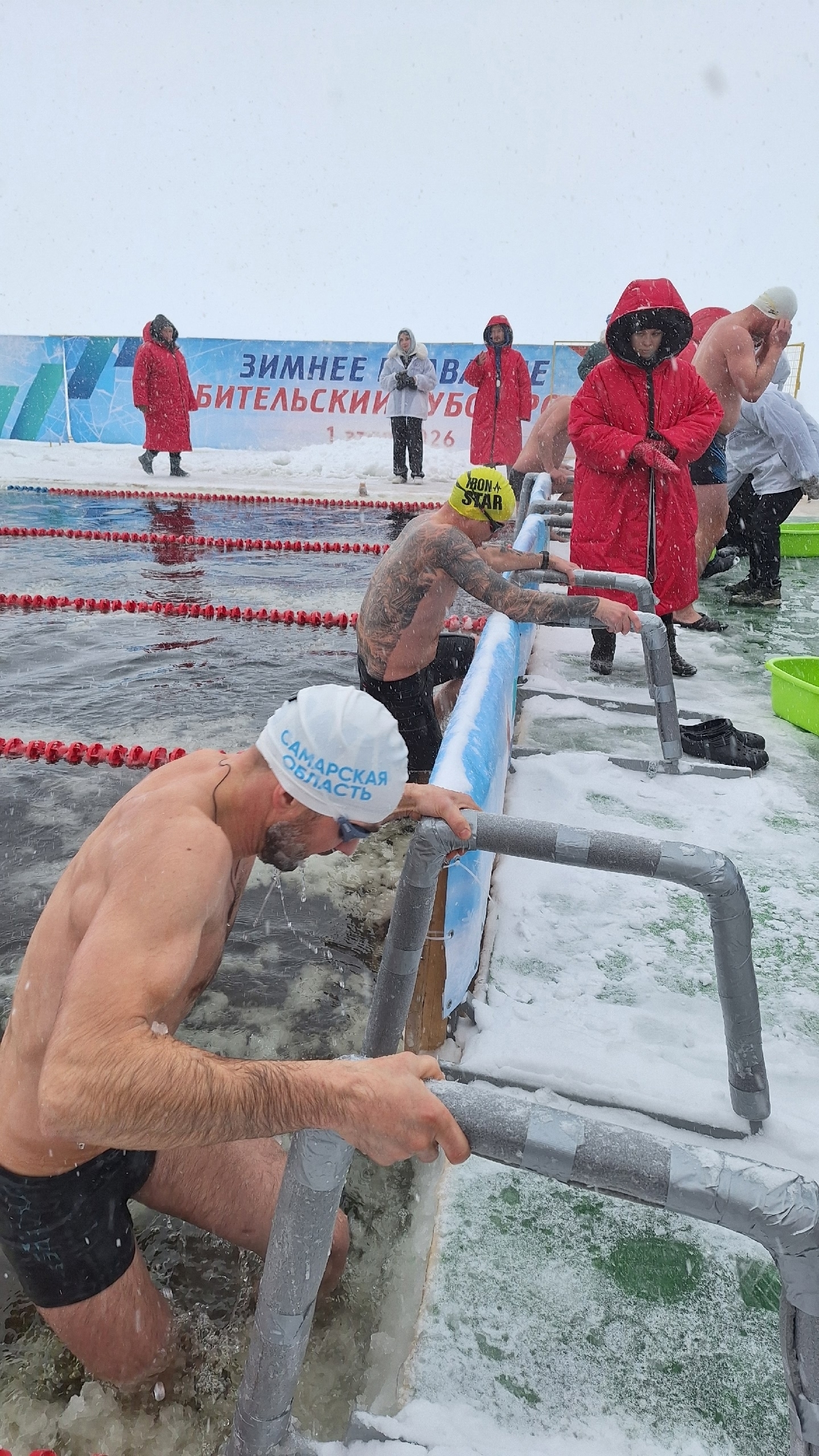 Соревнования проходили в сложных погодных условиях: температура воздуха составляла от -12 до -8 градусов, а температура воды +0,5 градусов. Снегопад, подаренный циклоном "Френсис", превращал поверхность бассейна в смесь воды, снега и ледовой крошки. Между заплывами спортсмены согревались в мобильной бане и КАМАЗе, оборудованном под военно-полевой душевой комплекс.