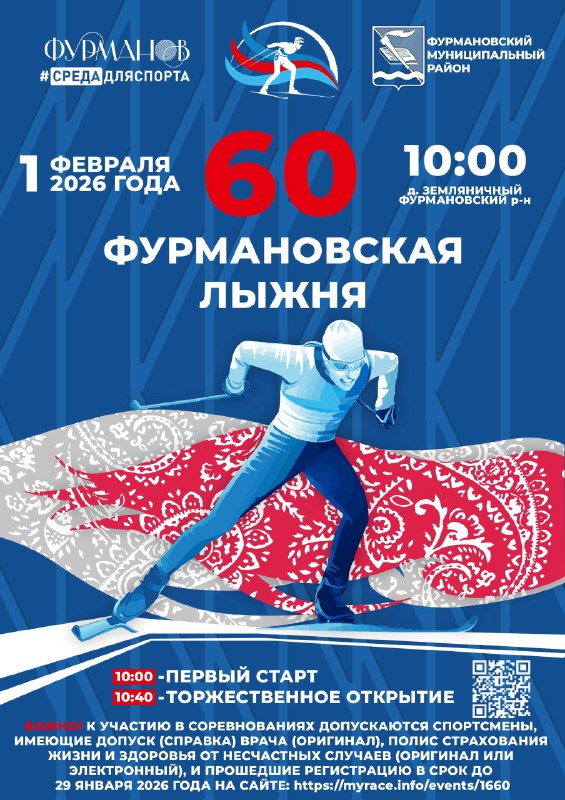 В воскресенье, 1 февраля, состоится 60-я юбилейная открытая лыжная гонка "Фурмановская лыжня-2026", сообщает администрация района. Традиционно лыжников принимает д. Земляничный Широковского сельского поселения. Участникам потребуется медстраховка.