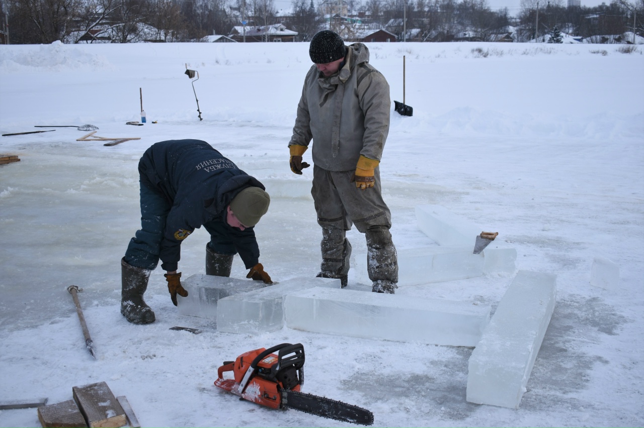 Купель традиционно вырежут во льду в виде креста. В ней уже организовали безопасные деревянные сходы. Работники управления городского хозяйства подготовят деревянные подходы к Иордани.