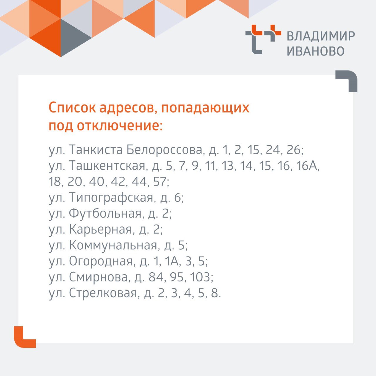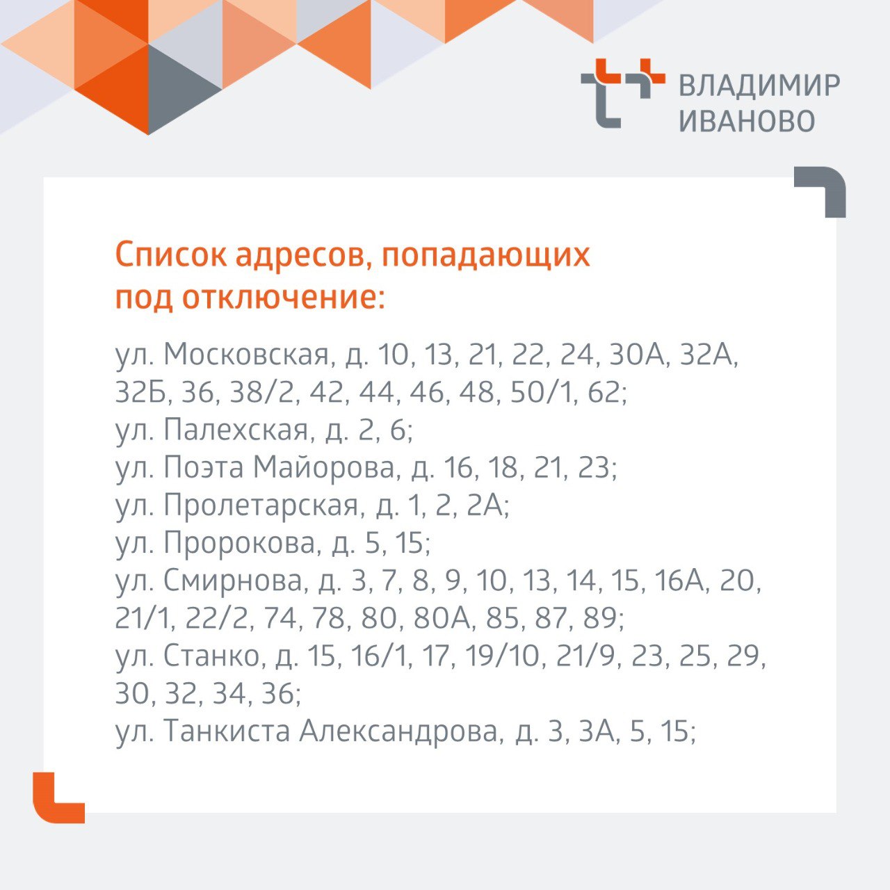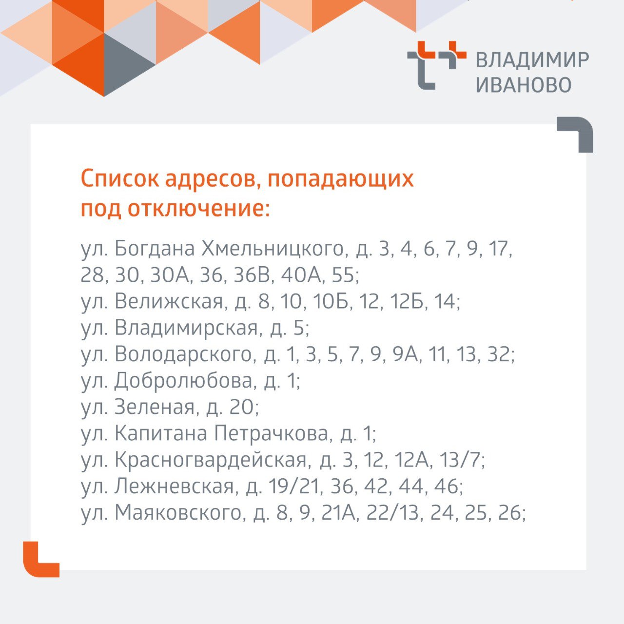 Адреса домов, попавших под отключение, смотрите в карточках.