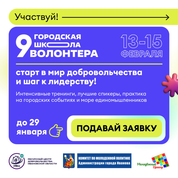 Стартовал набор в IX Ивановскую городскую школу волонтера, сообщает пресс-служба администрации г. Иванова. Это ежегодный образовательный проект, направленный на всестороннее развитие руководителей и лидеров волонтерского движения. Заявки можно подавать до 29 января.