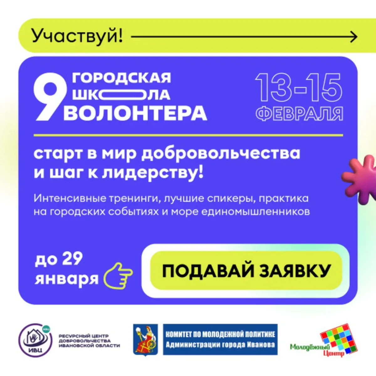 – "Организуй!" – направление для людей с опытом работы. В его рамках пройдет сертификация кандидатов в тим–лидеры Ивановского волонтерского центра. Участникам на 1 мая 2026 года должно исполниться 16 лет.