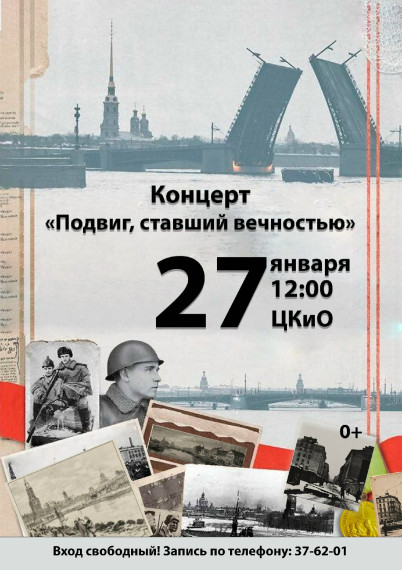 В в Арт‑резиденции "Центр Авангарда" (г. Иваново, пр. Ленина, 114) во вторник, 27 января, пройдет урок-концерт "Подвиг, ставший вечностью", сообщает мэрия. Программа посвящена 82‑й годовщине со дня полного освобождения Ленинграда от фашистской блокады. Вход свободный по предварительной записи. Начало в 12:00.