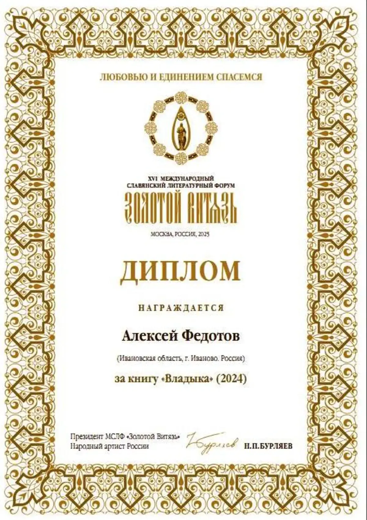 Историческая повесть ивановского автора Алексея Федотова "Владыка" отмечена дипломом XVI Международного славянского литературного форума "Золотой витязь" в номинации "Проза". Об этом Известно.ру сообщил автор.