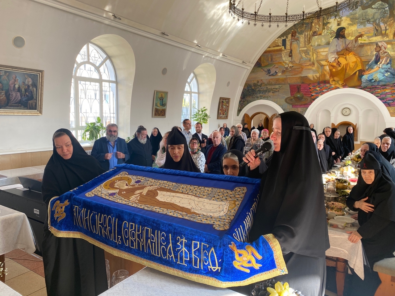 Плащаницу сестры обители вышивали на 75-летие матушки игумении Марии (Перепеча) – так исполнилась ее давняя мечта показать всем, что истинной хозяйкой монастыря является Пресвятая Богородица.
